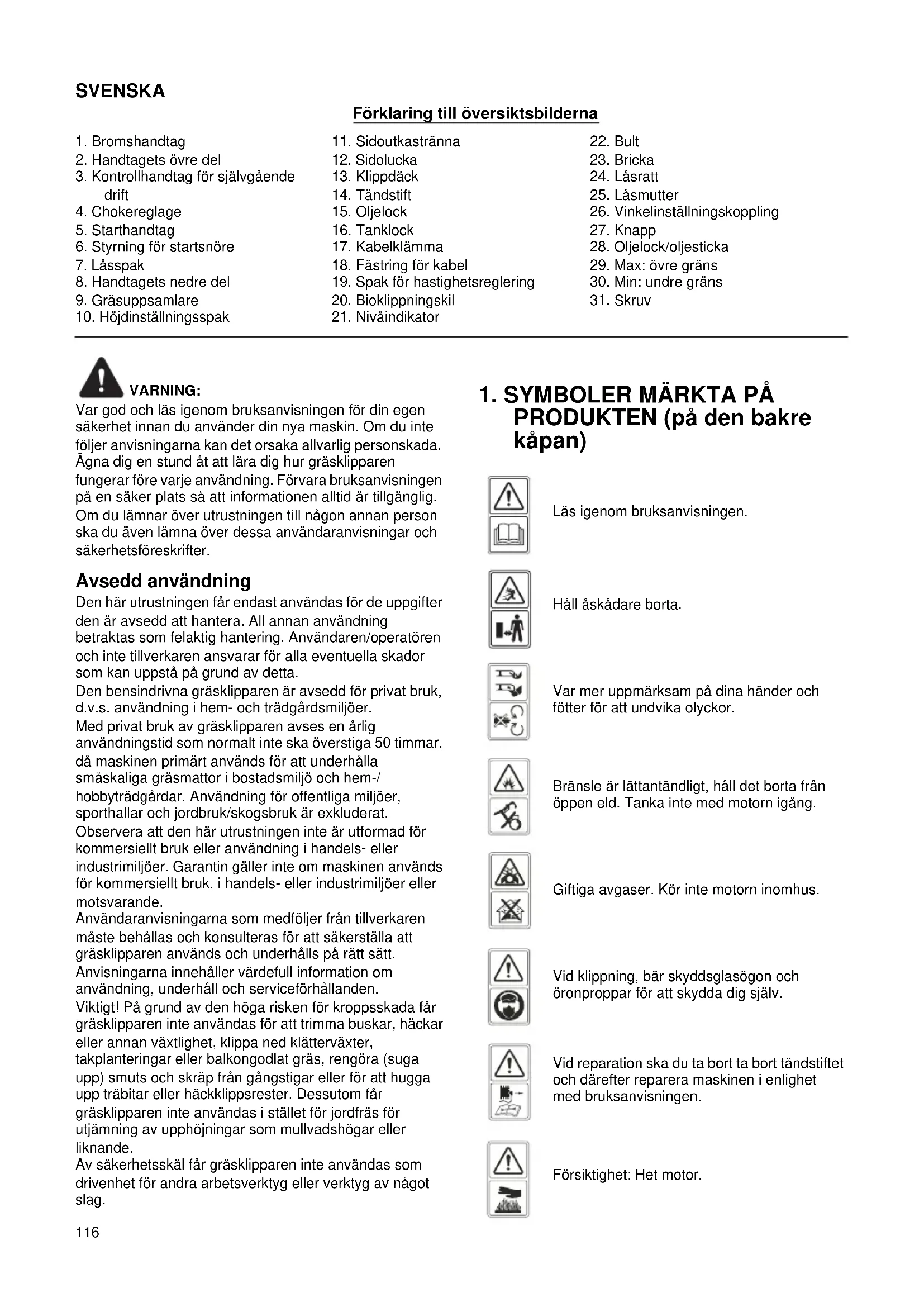 Läs igenom bruksanvisningen. Håll åskådare borta. Var mer uppmärksam på dina händer och fötter för att undvika olyckor. Bränsle är lättantändligt, håll det borta från öppen eld. Tanka inte med motorn igång. Giftiga avgaser. Kör inte motorn inomhus. Vid klippning, bär skyddsglasögon och öronproppar för att skydda dig själv. Vid reparation ska du ta bort ta bort tändstiftet och därefter reparera maskinen i enlighet med bruksanvisningen. Försiktighet: Het motor.117