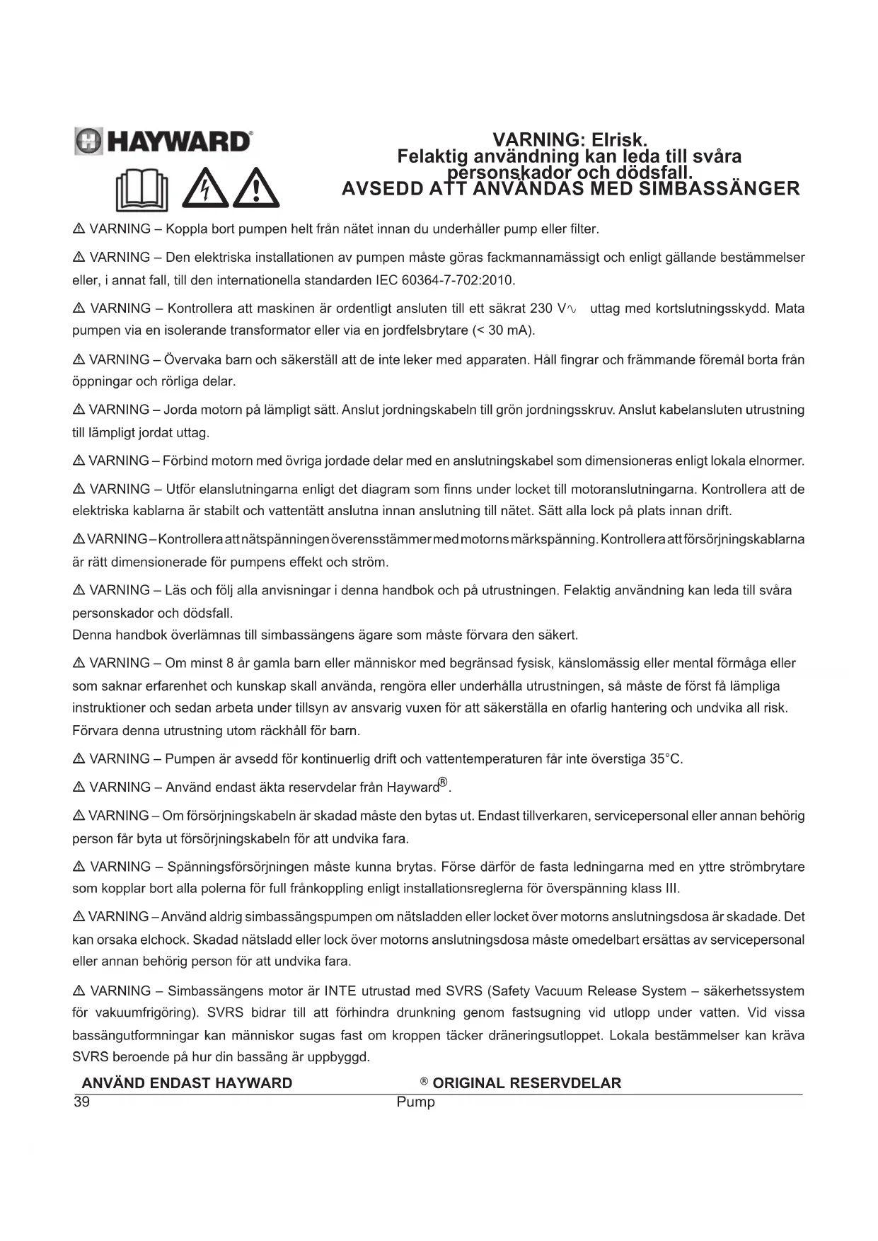- VARNING – Simbassängens motor är INTE utrustad med SVRS (Safety Vacuum Release System – säkerhetssystem för vakuumfrigöring). SVRS bidrar till att förhindra drunkning genom fastsugning vid utlopp under vatten. Vid vissa bassängutformningar kan människor sugas fast om kroppen täcker dräneringsutloppet. Lokala bestämmelser kan kräva SVRS beroende på hur din bassäng är uppbyggd. VARNING: Elrisk. Felaktig användning kan leda till svåra personskador och dödsfall. AVSEDD ATT ANVÄNDAS MED SIMBASSÄNGER c•ANVÄND ENDAST HAYWARD