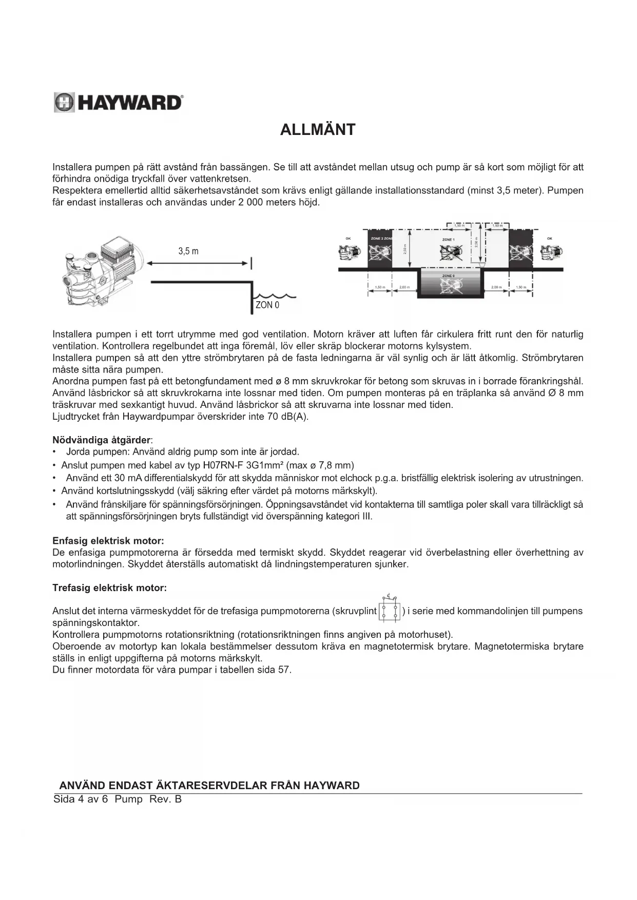 - Använd frånskiljare för spänningsförsörjningen. Öppningsavståndet vid kontakterna till samtliga poler skall vara tillräckligt så att spänningsförsörjningen bryts fullständigt vid överspänning kategori III. Enfasig elektrisk motor: De enfasiga pumpmotorerna är försedda med termiskt skydd. Skyddet reagerar vid överbelastning eller överhettning av motorlindningen. Skyddet återställs automatiskt då lindningstemperaturen sjunker. Trefasig elektrisk motor: Anslut det interna värmeskyddet för de trefasiga pumpmotorerna (skruvplint ) i serie med kommandolinjen till pumpens spänningskontaktor. Kontrollera pumpmotorns rotationsriktning (rotationsriktningen finns angiven på motorhuset). Oberoende av motortyp kan lokala bestämmelser dessutom kräva en magnetotermisk brytare. Magnetotermiska brytare ställs in enligt uppgifterna på motorns märkskylt. Du finner motordata för våra pumpar i tabellen sida 57.ANVÄND ENDAST ÄKTARESERVDELAR FRÅN HAYWARD Sida 5 av 6 Pump Rev. B Elanslutning: Kontrollera att nätspänningen överensstämmer med motorns märkspänning. Kontrollera att försörjningskablarna är rätt dimensionerade för pumpens effekt och ström. All elektrisk anslutning av pumpen och ev. byte av försörjningskablar får endast utföras av behörig person för att undvika fara. Utför elanslutningarna enligt det diagram som finns under locket till motoranslutningarna. Kontrollera att de elektriska kablarna är stabilt och vattentätt anslutna innan anslutning till nätet. Ta bort ev. fördragna kablar på vissa pumpar innan pumparna ansluts till nätet. Sådana fördragna kablar används endast för prov vid tillverkningen. INSTALLATION Installera simbassängens pump så att tryckfallet blir så litet som möjligt. Pumpen måste samtidigt stå minst 3,5 m från bassängen enligt installationsstandard. Installera sugledningen med en lätt stigning upp till pumpaxeln. Kontrollera att anslutningarna sitter ordentligt och är vattentäta. Dra emellertid inte rören för hårt. Använd endast Teflon som vattentät plast. Sugledningens diameter måste stå i förhållande till tryckledningens. Undvik fuktiga och dåligt ventilerade utrymmen. Motorn kräver att kylluften får cirkulera fritt. VIKTIGT: Kontrollera motorns rotationsriktning innan du ansluter den fast. ANVISNINGAR FÖR START OCH LUFTTÖMNING: Fyll förfilterhuset med vatten upp till sugledningen. Kör aldrig pumpen utan vatten. Vatten krävs för kylning och för axelpackningens smörjning. Öppna alla ventiler till sug- och tryckledningar. Öppna avluftningsventilen om sådan finns. (All luft måste ut ur sugledningarna.) Starta generatorn och vänta lämplig tid för lufttömning. Räkna med minst fem minuter för lufttömning (tiden beror på sughöjd och sugledningens längd). Se Felsökning om pumpen inte startar eller inte töms på luft. UNDERHÅLL