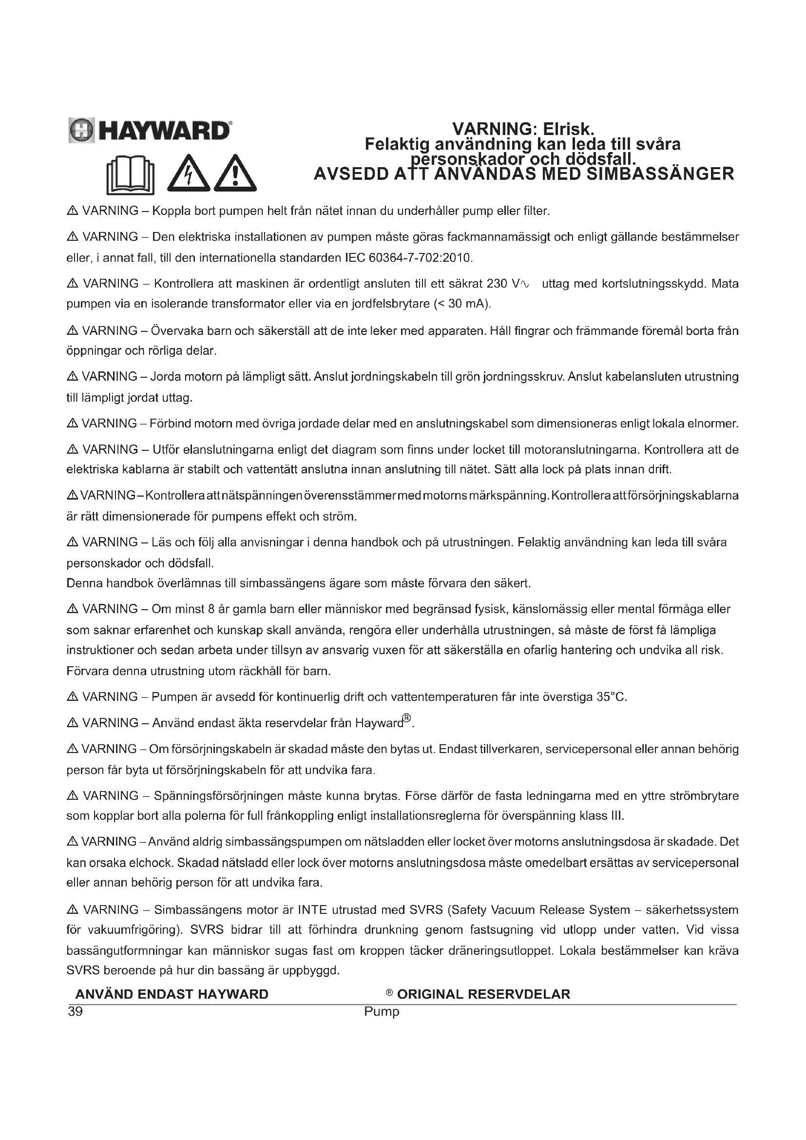 - VARNING – Simbassängens motor är INTE utrustad med SVRS (Safety Vacuum Release System – säkerhetssystem för vakuumfrigöring). SVRS bidrar till att förhindra drunkning genom fastsugning vid utlopp under vatten. Vid vissa bassängutformningar kan människor sugas fast om kroppen täcker dräneringsutloppet. Lokala bestämmelser kan kräva SVRS beroende på hur din bassäng är uppbyggd. VARNING: Elrisk. Felaktig användning kan leda till svåra personskador och dödsfall. AVSEDD ATT ANVÄNDAS MED SIMBASSÄNGER c•ANVÄND ENDAST HAYWARD