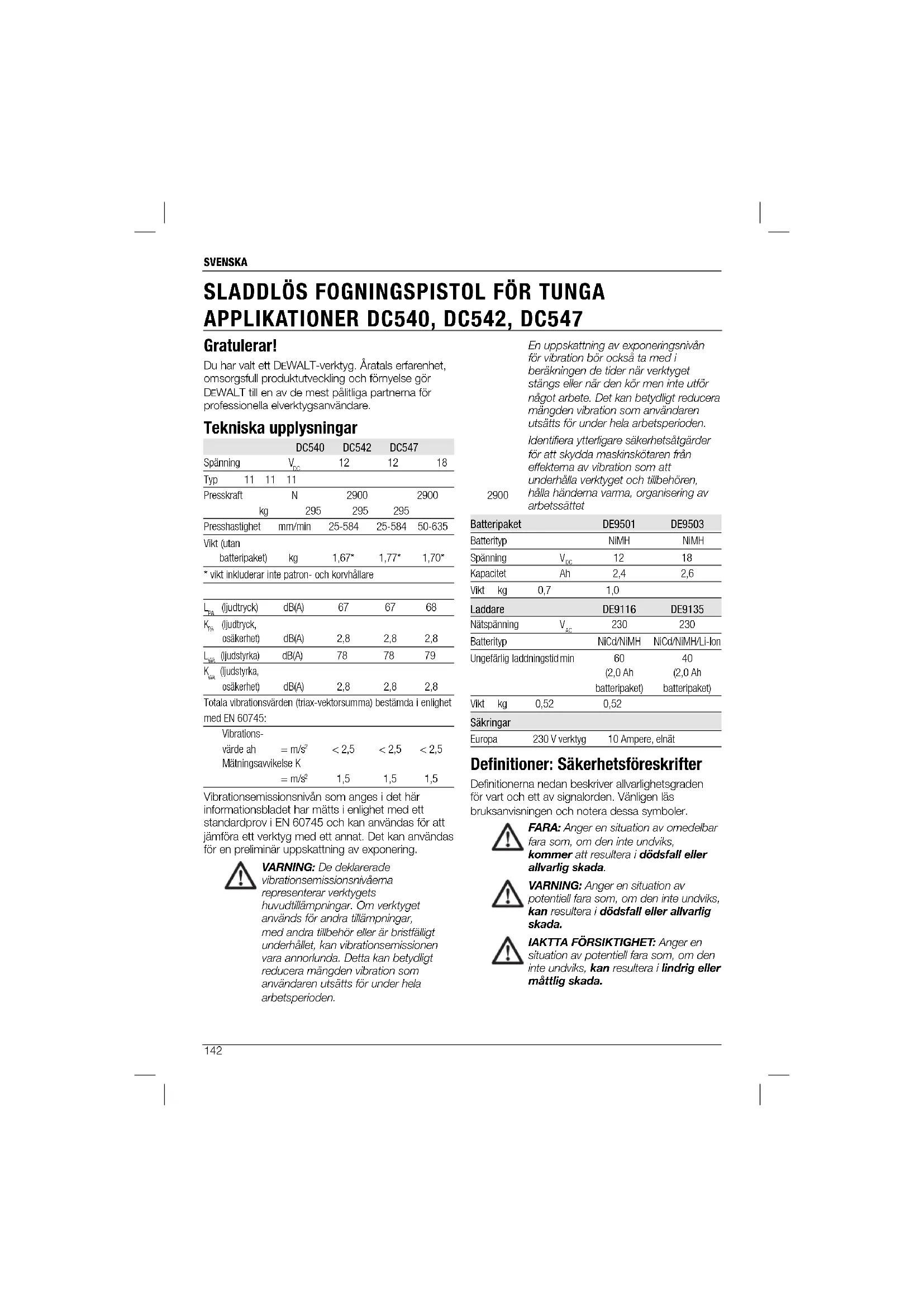 Hitta enhetens manual gratis DC540 DEWALT i PDF-format.