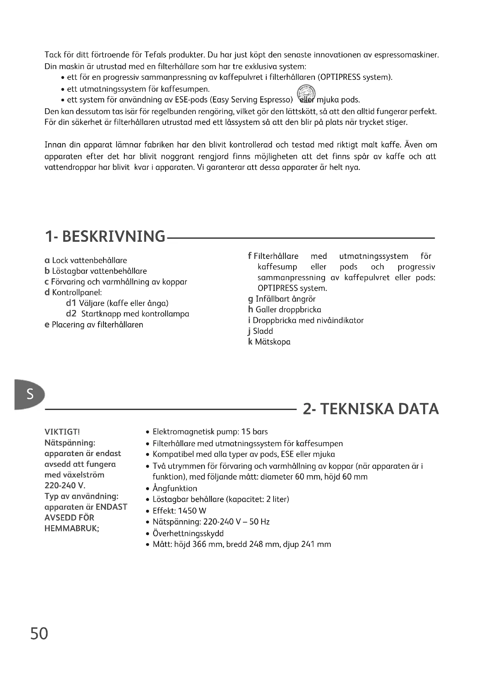 a Lock vattenbehållare b Löstagbar vattenbehållare c Förvaring och varmhållning av koppar d Kontrollpanel: d1 Väljare (kaffe eller ånga) d2 Startknapp med kontrollampa e Placering av filterhållaren f Filterhållare med utmatningssystem för kaffesump eller pods och progressiv sammanpressning av kaffepulvret eller pods: OPTIPRESS system. g Infällbart ångrör h Galler droppbricka i Droppbricka med nivåindikator j Sladd k Mätskopa Tack för ditt förtroende för Tefals produkter. Du har just köpt den senaste innovationen av espressomaskiner. Din maskin är utrustad med en filterhållare som har tre exklusiva system: