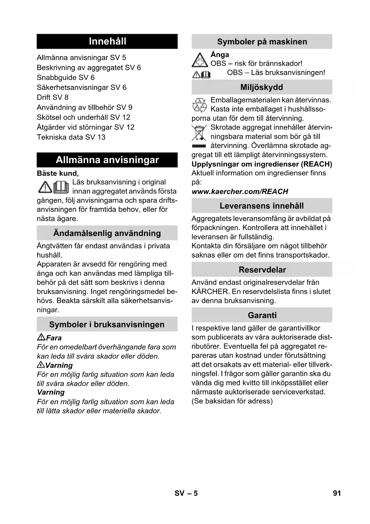 - •• Bommull, lin Pleie og vedlikehold Spyling av vanntank 88 NO– 12 Merk: Hvis det utelukkende brukes destil- lert vann, er det ikke nødvendig å avkalke kjelen. Siden det setter seg kalk på veggene i kje- len, anbefaler vi å avkalke dampkjelen med følgende intervaller (TF=tankfyllinger): Merk: Du kan finne ut hvor hardt vannet er ved å henvende deg til ditt lokale vannverk. Trekk ut støpselet fra veggkontakten. La apparatet avkjøles. Skru sikkerhetslåsen av apparatet. Tøm ut alt vann av kjelen (se figur ). 몇 Advarsel Bruk utelukkende produkter som er god- kjent av KÄRCHER, for å unngå skade på apparatet. For avkalkning bruk KÄRCHER avkal- kersticks (bestillingsnr. 6.295-047). Ved bruk av avkalkerløsningen følg dose- ringsanvisningene på pakken. Forsiktig! Vær forsiktig når du fyller og tømmer dam- prenseren. Avkalkingsoppløsningen kan angripe ømfintlige overflater. Fyll avkalkingsoppløsningen i vanntan- ken og la den virke i ca. 8 timer. 몇 Advarsel Under avkalkingen må sikkerhetslåsen ikke skrus til på apparatet. Bruk aldri damprenseren mens det er av- kalkingsmiddel i kjelen. Tøm ut all avkalkingsoppløsning etter 8 timer. Det blir værende igjen en rest- mengde med oppløsning i kjelen, og den må derfor skylles to til tre ganger med kaldt vann for å fjerne alt gjenvæ- rende avkalkingsmiddel. Tøm ut alt vann av kjelen (se figur ). Merk: Gulvkluter og frottétrekk er forvasket og kan umiddelbart tas i bruk sammen med damprenseren. Vask tilsmussede gulvkluter og frotté- trekk ved 60°C i vaskemaskinen. For at klutene skal beholde egenskapene for høyt smussopptak, skal det ikke brukes tøymykner. Klutene kan tørkes i tørke- trommel. Driftsforstyrrelser har oftest enkle årsaker som du selv kan utbedre ved hjelp av føl- gende oversikt. I tvilstilfeller, eller ved drifts- forstyrrelser som ikke er nevnt her, kan du kontakte vår autoriserte kundeservice. Fare Vedlikeholdsarbeid må kun utføres når støpselet er trukket ut og damprenseren er avkjølt. Reparasjonsarbeider på apparatet må kun utføres av autorisert kundeservice. Avkalk dampkjelen. Slå av maskinen. Se „Etterfylle vann“ Side 9. Damphendelen er sikret med låsingen/bar- nesikringen. Still valgbryteren for dampmengden for- over. Still temperaturregulatoren til trinn ••• . Spyl kjelen på dampvaskeren eller bruk kalkfjerner. Ved lengre pauser i strykingen kan damp kondenseres i dampledningen. Derfor, rett den første dampstøten mot et separat tørkle. Avkalking av vanntank Hardhetsgrad ° dH mmol/l TF I bløtt 0- 7 0-1,3 55 II middels 7-14 1,3-2,5 45 III hardt 14-21 2,5-3,8 35 IV meget hardt >21 >3,8 25 Pleie av tilbehøret Feilretting Lang oppvarmingstid Kalkavleiringer i dampkjelen Ingen damp Dampkjelen er tom for vann Damphåndtaket lar seg ikke trykke inn Dampstrykejernet "spytter" vann! Etter pauser i strykingen kan det komme vanndråper ut av dampstrykejernet. 89NO– 13 Damppistolen trykkes helt til det kom- mer mindre vann ut. Avkalk dampkjelen. Det tas forbehold om tekniske endringer! Stort vannutløp Dampkjele er for full. Kalkavleiringer i dampkjelen Tekniske data Strømtilkobling Spenning 220-240 V 1~50/60 Hz Beskyttelsesklasse I Beskyttelsesklasse IPX4 Effektspesifikasjoner Varmeeffekt 1800 W Varmeeffekt Strykejern 700 W Maks. driftstrykk 0,35 MPa Oppvarmingstid 6 Minut- ter Dampvolum - Permanent damping 50 g/min - Damptrinn maks. 110 g/min Mål Dampkjele 1,0 l Vekt (uten tilbehør) 3,1 kg Bredde 250 mm Lengde 382 mm Høyde 256 mm 90 NOSvenska – 5 Bäste kund, Läs bruksanvisning i original innan aggregatet används första gången, följ anvisningarna och spara drifts- anvisningen för framtida behov, eller för nästa ägare. Ångtvätten får endast användas i privata hushåll. Apparaten är avsedd för rengöring med ånga och kan användas med lämpliga till- behör på det sätt som beskrivs i denna bruksanvisning. Inget rengöringsmedel be- hövs. Beakta särskilt alla säkerhetsanvis- ningar. Fara För en omedelbart överhängande fara som kan leda till svåra skador eller döden. 몇 Varning För en möjlig farlig situation som kan leda till svåra skador eller döden. Varning För en möjlig farlig situation som kan leda till lätta skador eller materiella skador. Ånga OBS – risk för brännskador! OBS – Läs bruksanvisningen! Emballagematerialen kan återvinnas. Kasta inte emballaget i hushållsso- porna utan för dem till återvinning. Skrotade aggregat innehåller återvin- ningsbara material som bör gå till återvinning. Överlämna skrotade ag- gregat till ett lämpligt återvinningssystem. Upplysningar om ingredienser (REACH) Aktuell information om ingredienser finns på: www.kaercher.com/REACH Aggregatets leveransomfång är avbildat på förpackningen. Kontrollera att innehållet i leveransen är fullständig. Kontakta din försäljare om något tillbehör saknas eller om det finns transportskador. Använd endast originalreservdelar från KÄRCHER. En reservdelslista finns i slutet av denna bruksanvisning. I respektive land gäller de garantivillkor som publicerats av våra auktoriserade dist- ributörer. Eventuella fel på aggregatet re- pareras utan kostnad under förutsättning att det orsakats av ett material- eller tillverk- ningsfel. I frågor som gäller garantin ska du vända dig med kvitto till inköpsstället eller närmaste auktoriserade serviceverkstad. (Se baksidan för adress) Innehåll Allmänna anvisningar SV 5 Beskrivning av aggregatet SV 6 Snabbguide SV 6 Säkerhetsanvisningar SV 6 Drift SV 8 Användning av tillbehör SV 9 Skötsel och underhåll SV 12 Åtgärder vid störningar SV 12 Tekniska data SV 13 Allmänna anvisningar Ändamålsenlig användning Symboler i bruksanvisningen Symboler på maskinen Miljöskydd Leveransens innehåll Reservdelar Garanti 91SV– 6 I denna bruksanvisning beskrivs aggrega- tet med maximal utrustning. Leveransom- fånget varierar allt efter modell (se förpackningen). Figurer och 