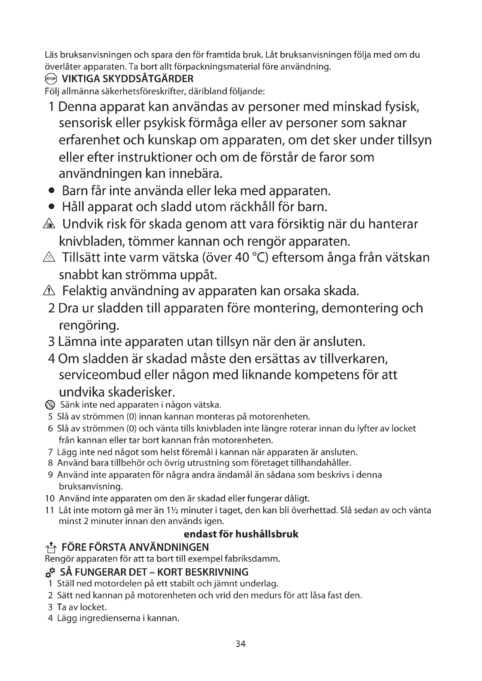 1 Denna apparat kan användas av personer med minskad fysisk, sensorisk eller psykisk förmåga eller av personer som saknar erfarenhet och kunskap om apparaten, om det sker under tillsyn erlerfter instruktioner och om de Förstår de faror som användningen kan innebära.