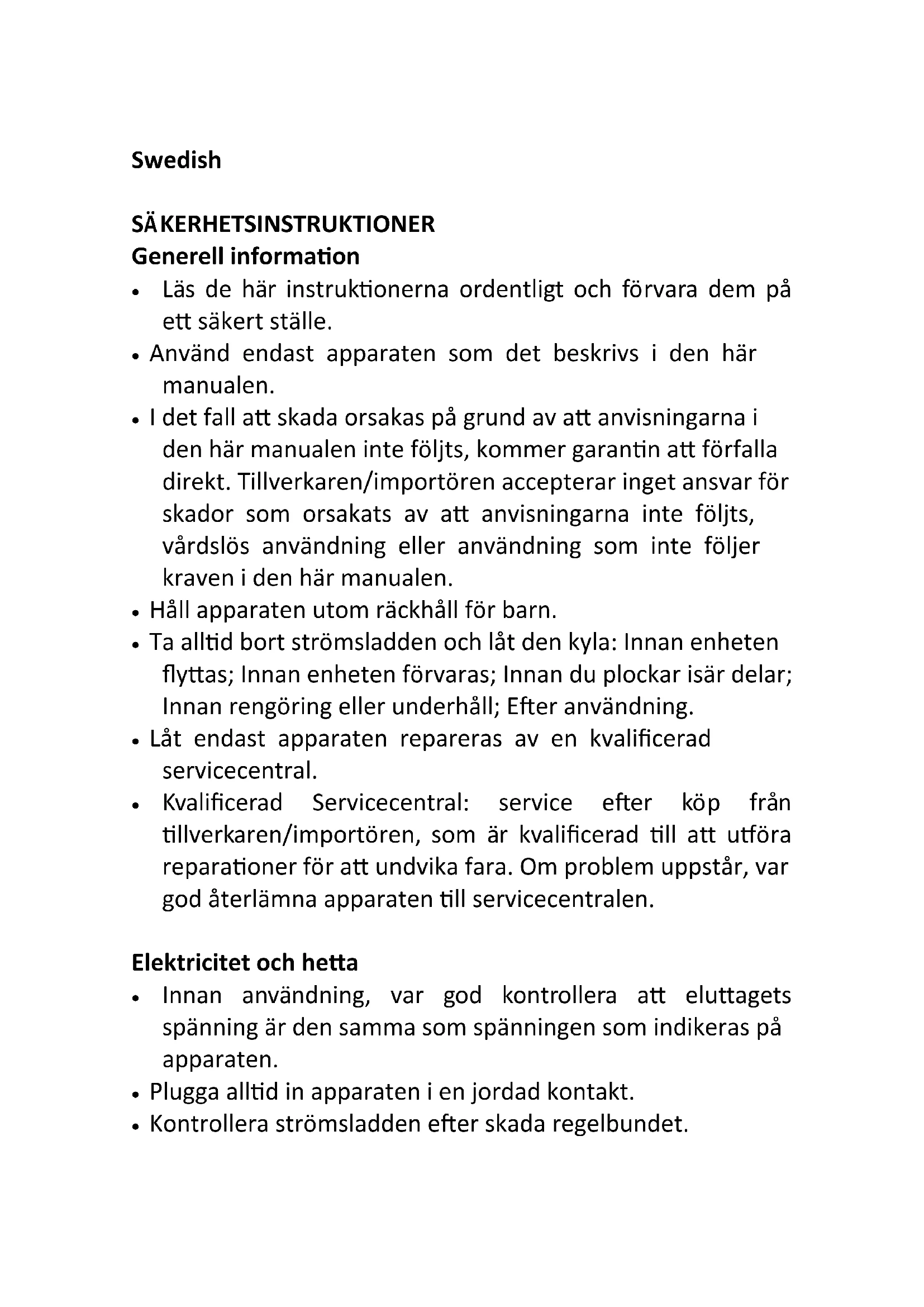 - Kvalificerad Servicecentral: service after köp frän tillverkaren/importören, som ar kvalificerad till att utföra reparationer für att undvika fara. Om problem uppstär, var god Återlämna apparaten till servicecentralen.