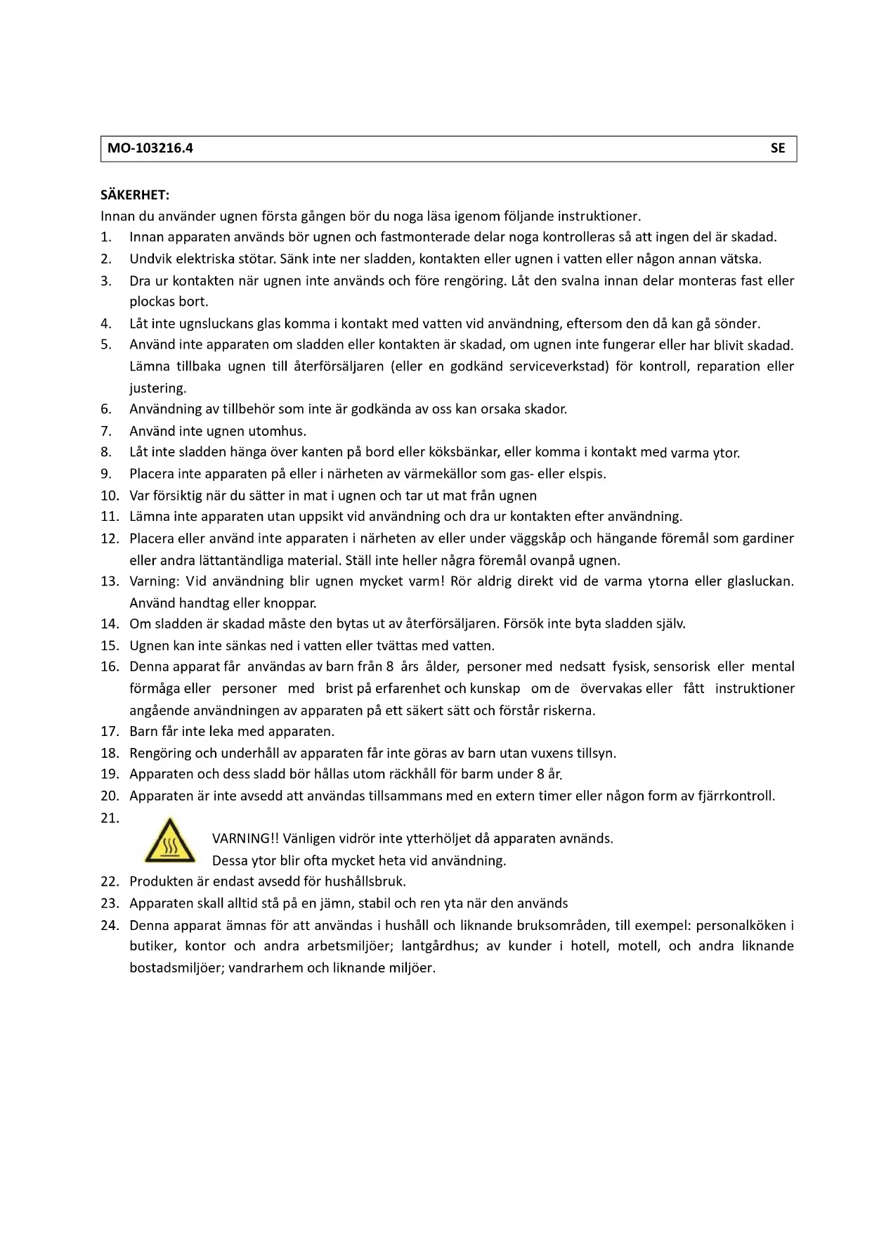 Varning: Vid användning blir ugnen mycket varm! Rör aldrig direkt vid de varma ytorna eller glasluckan. Använd handtag eller knoppar.