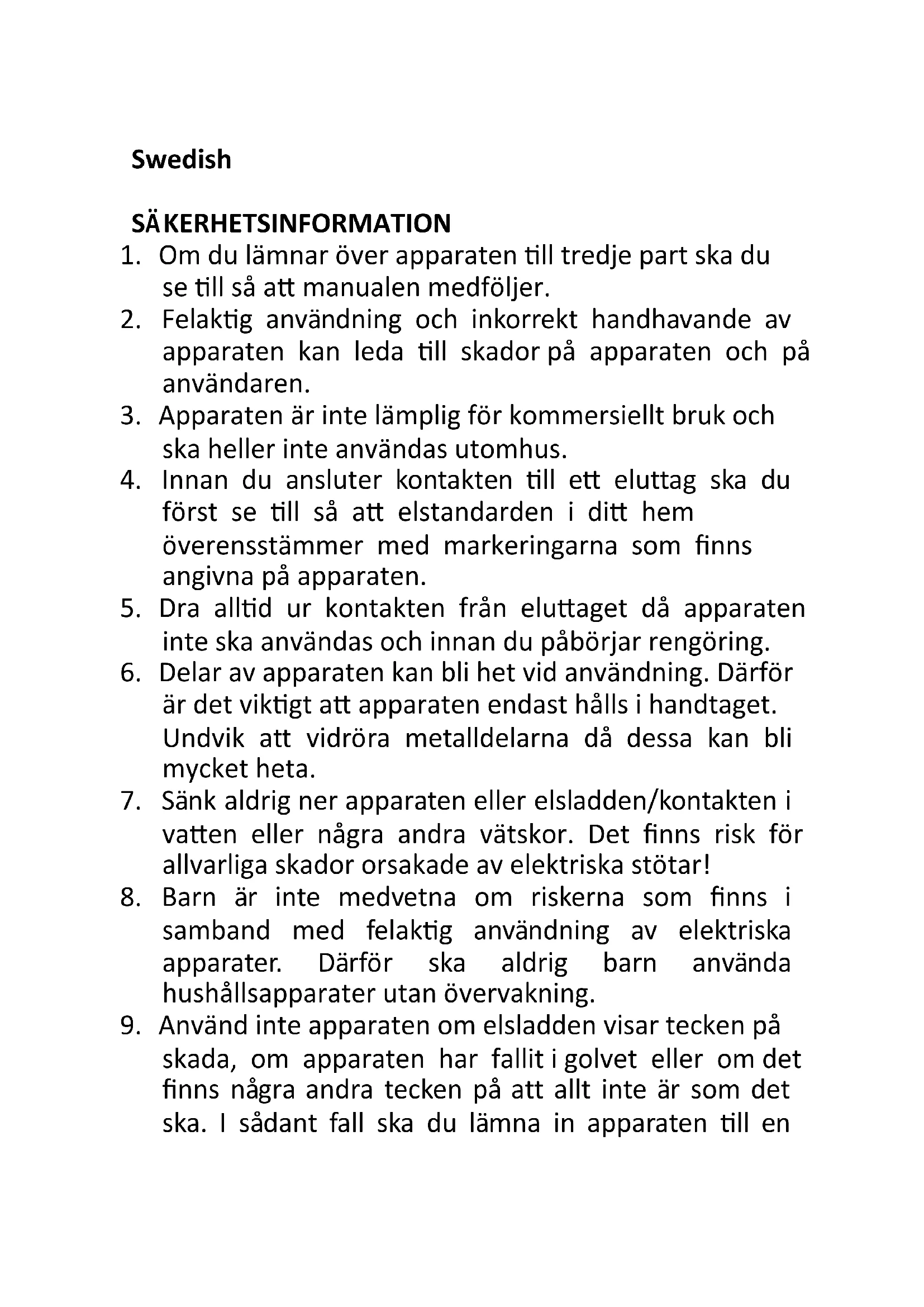 - Delar av apparaten kan bli het vid användning. Därför är det viktigt att apparaten endast hålls i handtaget. Undvik att vidröra metalldelarna då dessa kan bli mycket heta.