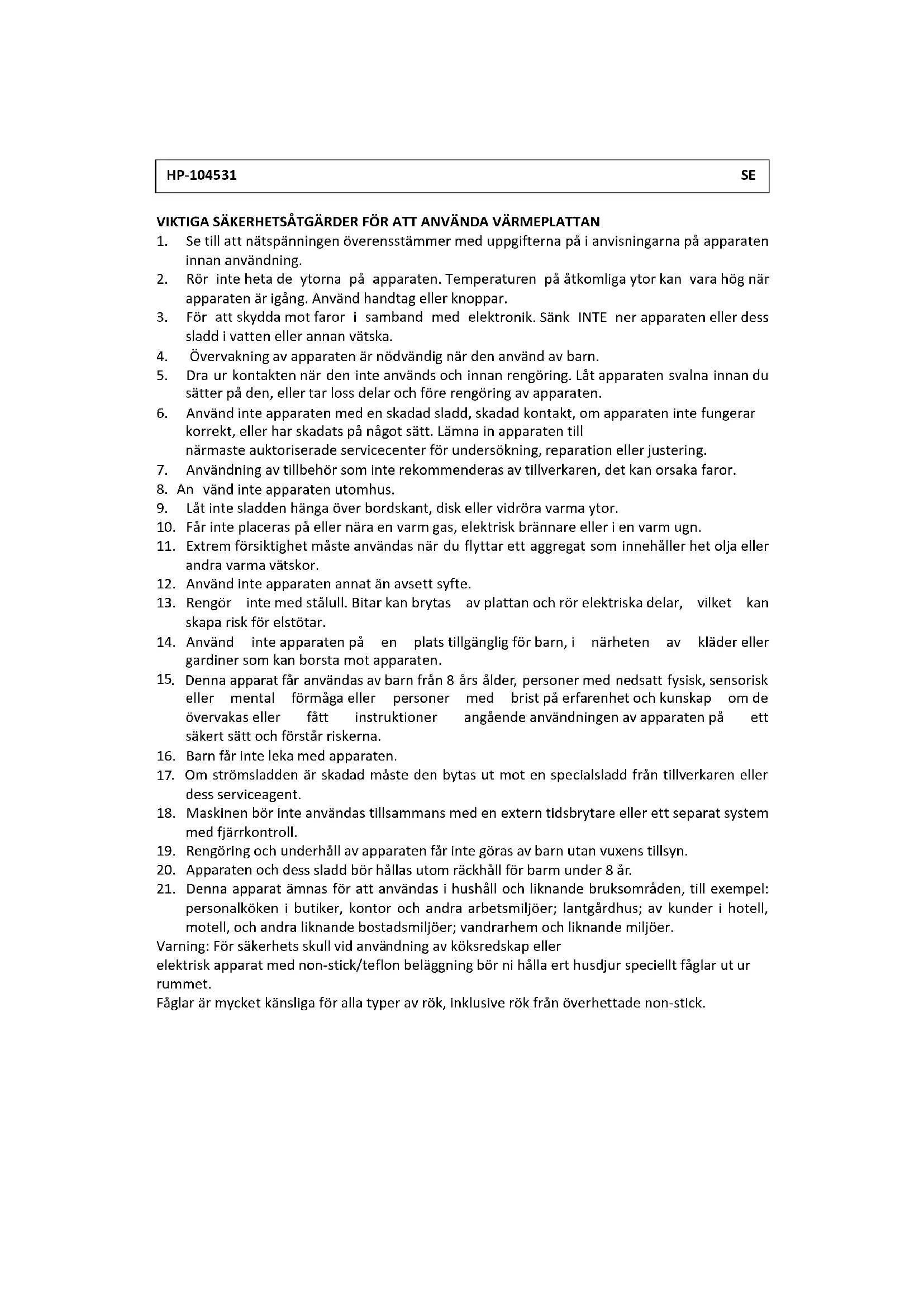 - Plattan blir varm direkt nar man slatt pa den. Ror INTE metallytorna runt omkring plattorna under uppvarmnng och anvandning de kan bli varma.