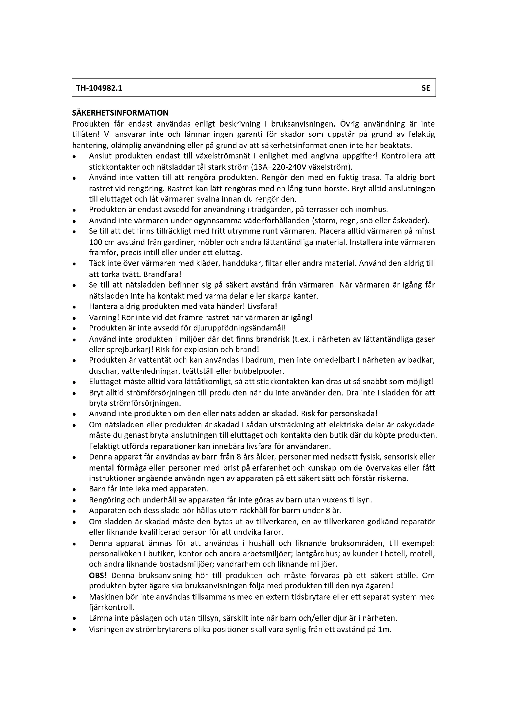 Anvand inte varmaren under ogynnsamma vaderforhallanden (storm, regn, sno aller askvder). - Se till att det finns tillräckligt med fritt utrémme runt värmaren. Placera alltid värmaren på minst 100 cm avständ fran gardiner, möbler och andra lättantändiga material. Installera inte värmaren framfor, precis intill eller under ett eluttag.