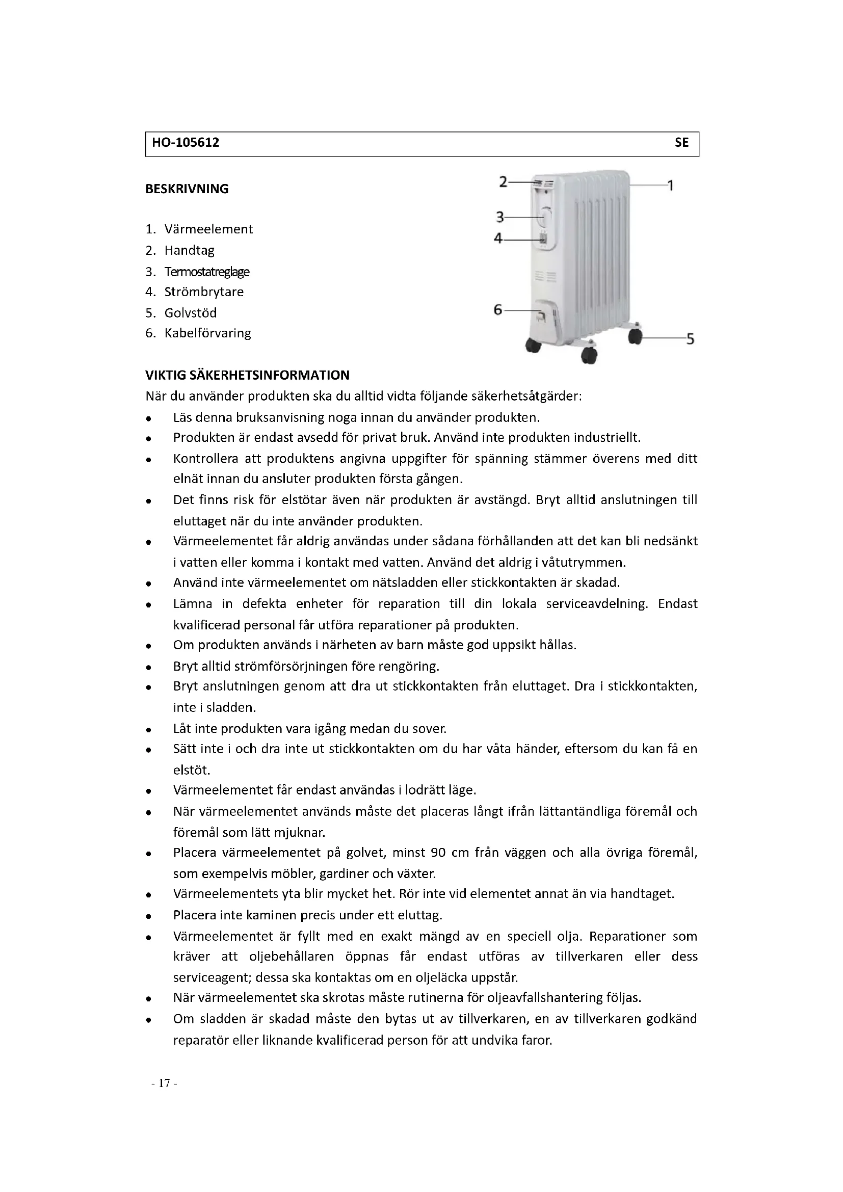 Värme elementet ar fyllt med en exakt mangd av en speciell olja. Reparationer som kraver att oljebehällaren öppnas fär endast utforas av tillverkaren aller dess serviceagent; dessa sk kontaktas om en oljeläcka uppstår.