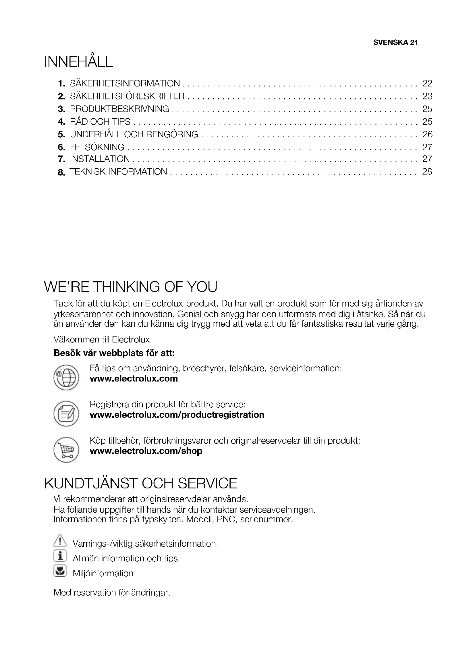 Vi rekommenderar att originalreservdelar används. Ha följande uppgifter till hands när du kontaktar serviceavdelningen. Informationen finns på typskylten. Modell, PNC, serienummer. Varnings-/viktig säkerhetsinformation. Allmän information och tips Miljöinformation Med reservation för ändringar.