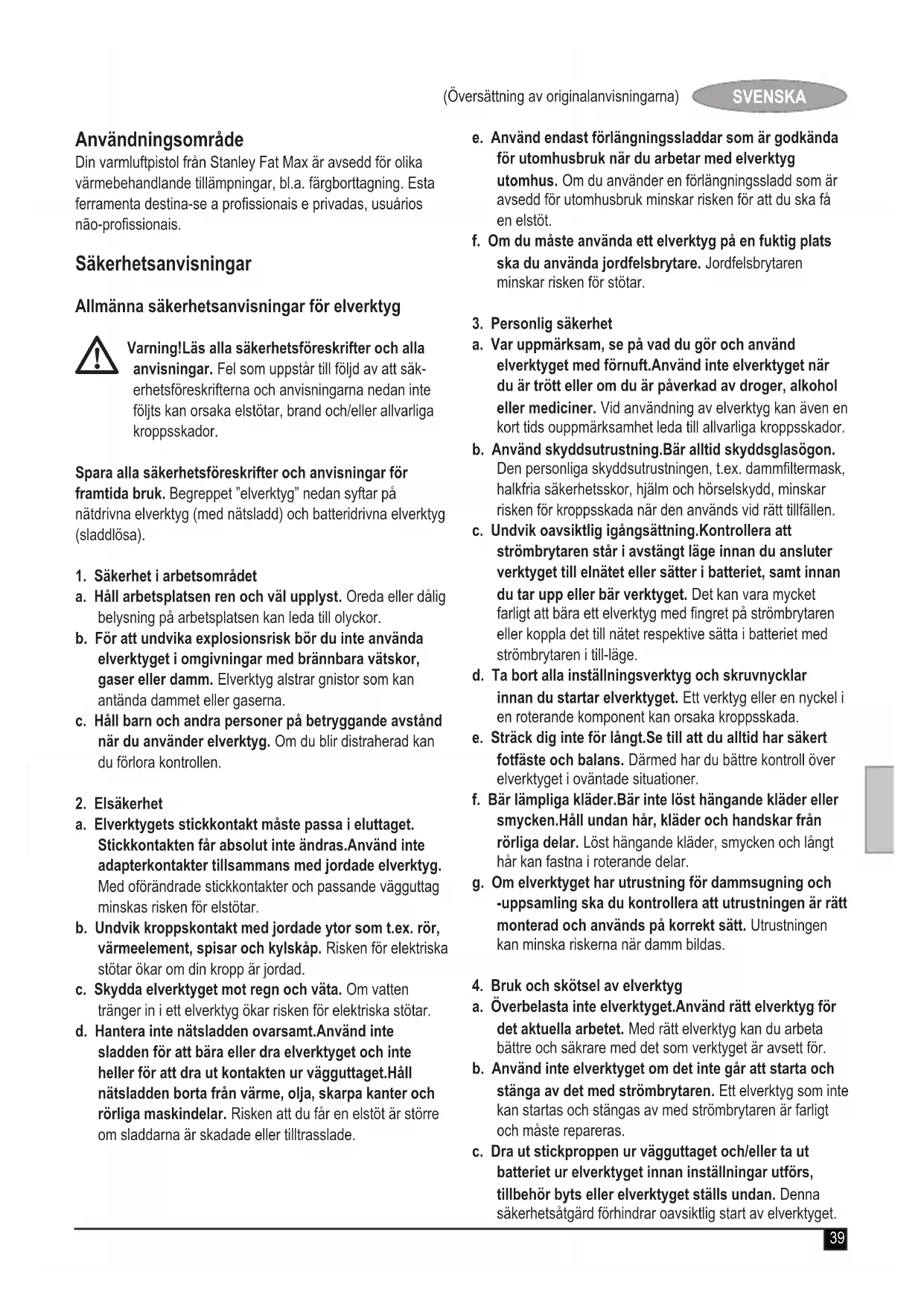 Om din Stanley Fat Max-produkt går sönder på grund av material- och/eller fabrikationsfel inom 12 månader från köpet, åtar sig Stanley Europe att byta ut alla trasiga delar utan kost- nad med minsta besvär för kunden eller, efter eget godtycke, utan kostnad byta ut produkten förutsatt att: u produkten inte har misskötts och har använts enligt bruksanvisningen. u produkten har utsatts för normalt slitage. u reparationer inte har utförts av personer som inte är auktoriserade reparatörer. u inköpskvitto nns. u Stanley Fat Max-produkten returneras komplett med alla originaldelar Om du vill göra ett garantianspråk kontaktar du åter- försäljaren, letar upp närmaste auktoriserade Stanley Fat Max-verkstad i Stanley Fat Max-katalogen eller kontaktar det lokala Stanley-kontoret på den adress som är angiven i bruksanvisningen.En lista över alla auktoriserade Stanley Fat Max-verkstäder samt servicevillkor nns på Internet:www. stanley.eu/344 (Oversettelse av de opprinnelige instruksjonene) NORSK Bruksområde Denne Stanley Fat Max-varmluftpistolen er konstruert for ulike oppvarmingsanvendelser, for eksempel malingsfjerning. Dette verktøyet ment for profesjonelle og private, ikke-profesjonelle brukere. Sikkerhetsinstruksjoner Generelle sikkerhetsadvarsler for elektroverktøy
