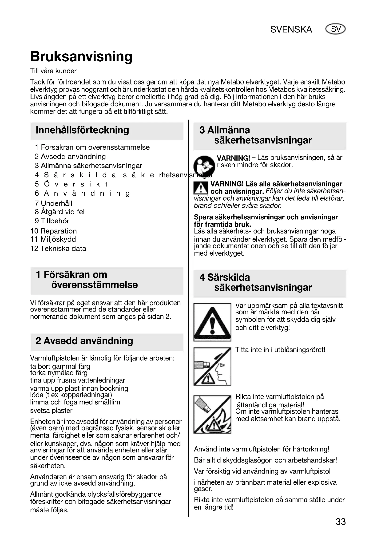 Tack för förtroendet som du visat oss genom att köpa det nya Metabo elverktyget. Varje enskilt Metabo elverktyg provas noggrant och är underkastat den härda kvalitetskontrollen hos Metabos kvalitetssäkring. Livslängden på ett elverktyg beror emellertid i hög grad på dig. Följ informationen i den här bruksanvisningen och bifogade dokument. Ju varsammare du hanterar ditt Metabo elverktyg desto längre kommer det att fungera på ett tillförlitligt sätt.