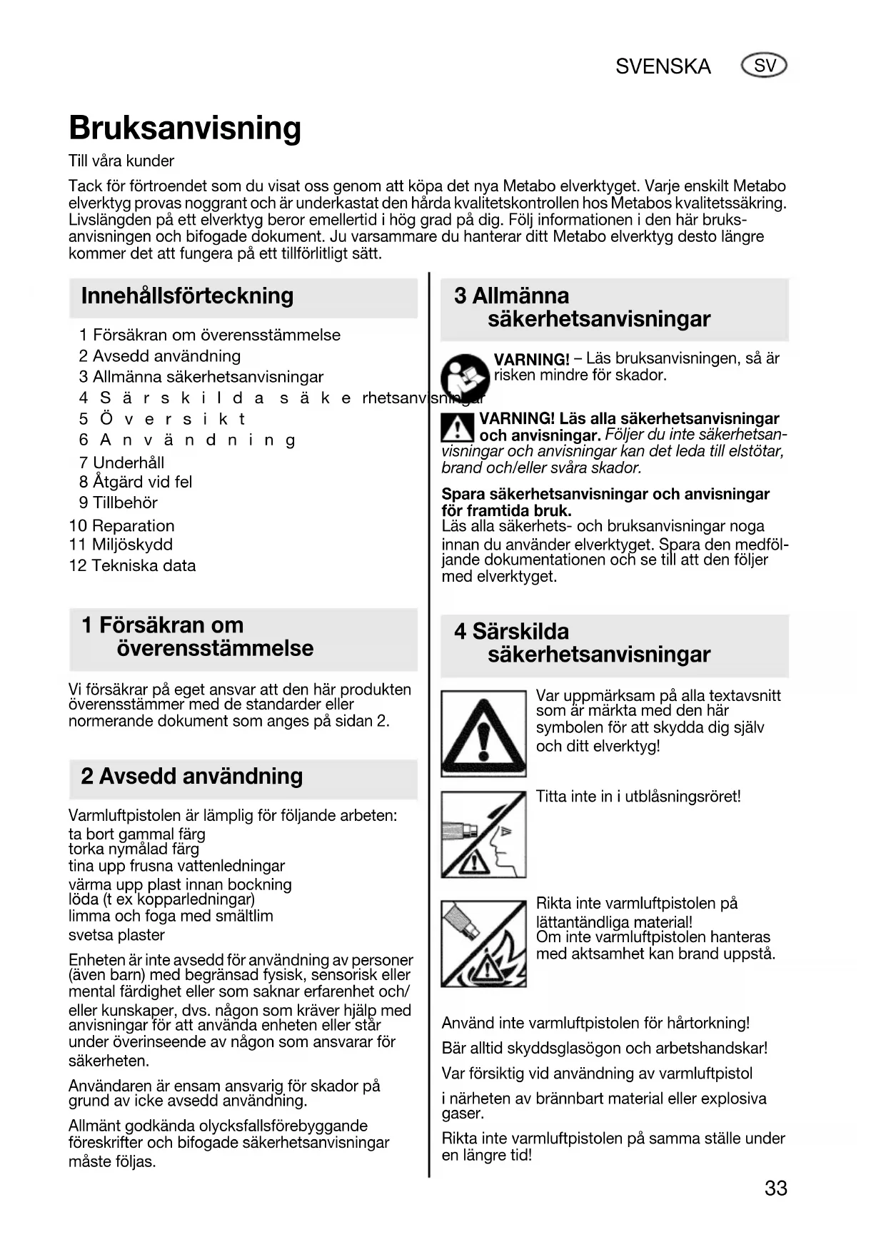 1 Försäkran om överensstämmelse 2 Avsedd användning 3 Allmänna säkerhetsanvisningar 4Särskilda säkerhetsanvisningar 5Översikt 6Användning 7 Underhåll 8 Åtgärd vid fel 9 Tillbehör 10 Reparation 11 Miljöskydd 12 Tekniska data Vi försäkrar på eget ansvar att den här produkten överensstämmer med de standarder eller normerande dokument som anges på sidan 2. Varmluftpistolen är lämplig för följande arbeten: ta bort gammal färg torka nymålad färg tina upp frusna vattenledningar värma upp plast innan bockning löda (t ex kopparledningar) limma och foga med smältlim svetsa plaster Enheten är inte avsedd för användning av personer (även barn) med begränsad fysisk, sensorisk eller mental färdighet eller som saknar erfarenhet och/ eller kunskaper, dvs. någon som kräver hjälp med anvisningar för att använda enheten eller står under överinseende av någon som ansvarar för säkerheten. Användaren är ensam ansvarig för skador på grund av icke avsedd användning. Allmänt godkända olycksfallsförebyggande föreskrifter och bifogade säkerhetsanvisningar måste följas. VARNING! – Läs bruksanvisningen, så är risken mindre för skador. VARNING! Läs alla säkerhetsanvisningar och anvisningar. Följer du inte säkerhetsan- visningar och anvisningar kan det leda till elstötar, brand och/eller svåra skador. Spara säkerhetsanvisningar och anvisningar för framtida bruk. Läs alla säkerhets- och bruksanvisningar noga innan du använder elverktyget. Spara den medföl- jande dokumentationen och se till att den följer med elverktyget. Var uppmärksam på alla textavsnitt som är märkta med den här symbolen för att skydda dig själv och ditt elverktyg! Titta inte in i utblåsningsröret! Rikta inte varmluftpistolen på lättantändliga material! Om inte varmluftpistolen hanteras med aktsamhet kan brand uppstå. Använd inte varmluftpistolen för hårtorkning! Bär alltid skyddsglasögon och arbetshandskar! Var försiktig vid användning av varmluftpistol i närheten av brännbart material eller explosiva gaser. Rikta inte varmluftpistolen på samma ställe under en längre tid! Bruksanvisning Till våra kunder Tack för förtroendet som du visat oss genom att köpa det nya Metabo elverktyget. Varje enskilt Metabo elverktyg provas noggrant och är underkastat den hårda kvalitetskontrollen hos Metabos kvalitetssäkring. Livslängden på ett elverktyg beror emellertid i hög grad på dig. Följ informationen i den här bruks- anvisningen och bifogade dokument. Ju varsammare du hanterar ditt Metabo elverktyg desto längre kommer det att fungera på ett tillförlitligt sätt. Innehållsförteckning 1 Försäkran om överensstämmelse 2 Avsedd användning 3 Allmänna säkerhetsanvisningar 4 Särskilda säkerhetsanvisningar 17024612_0409 HE 2300 HE 2000 H 1600.book Seite 33 Dienstag, 16. Juni 2009 11:40 1134 SVENSKA