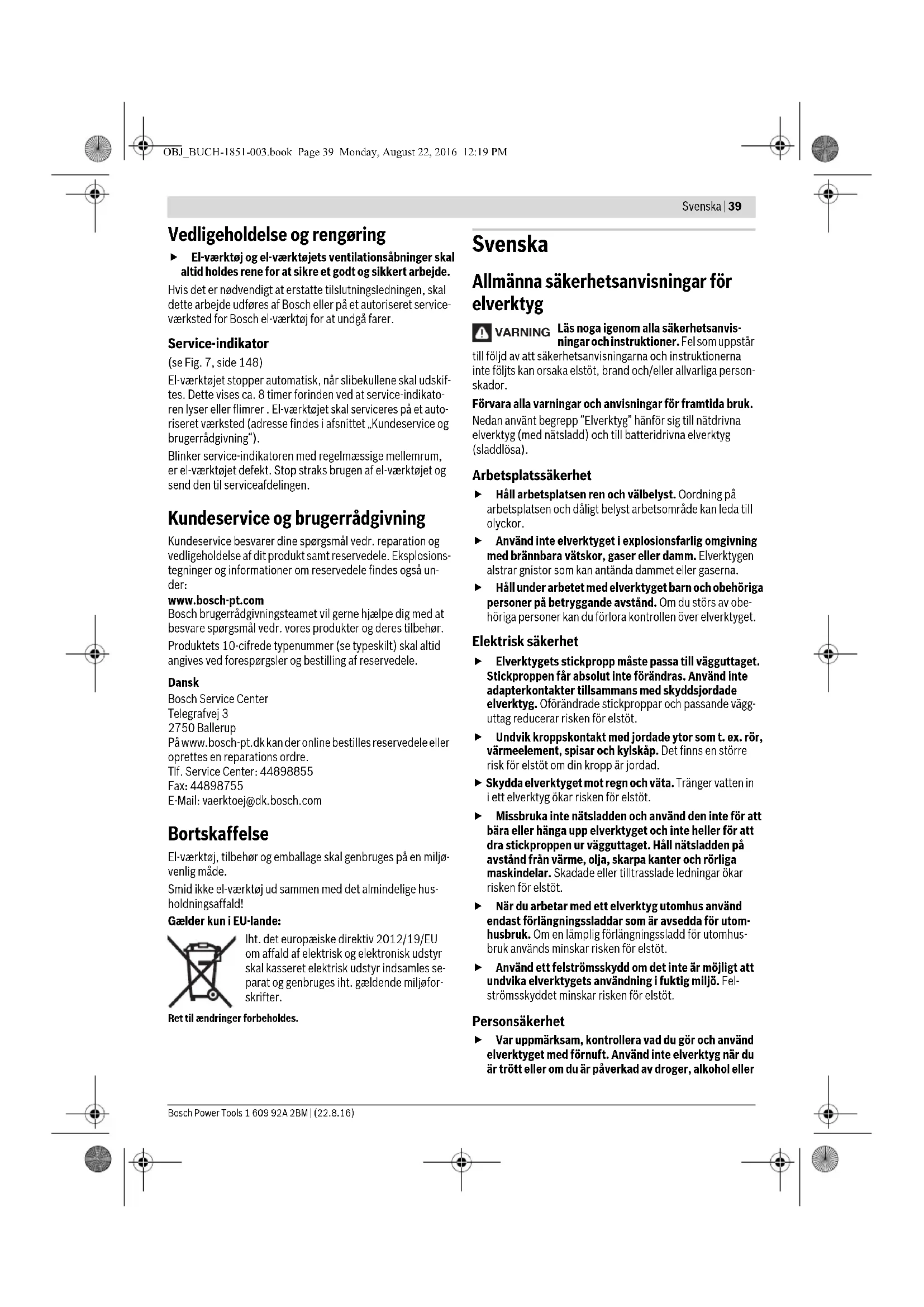 OBJ_BUCH-1851-003.book Page 38 Monday, August 22, 2016 12:19 PMSvenska | 39 Bosch Power Tools 1 609 92A 2BM | (22.8.16) Vedligeholdelse og rengøring El-værktøj og el-værktøjets ventilationsåbninger skal altid holdes rene for at sikre et godt og sikkert arbejde. Hvis det er nødvendigt at erstatte tilslutningsledningen, skal dette arbejde udføres af Bosch eller på et autoriseret service- værksted for Bosch el-værktøj for at undgå farer. Service-indikator (se Fig. 7, side 148) El-værktøjet stopper automatisk, når slibekullene skal udskif- tes. Dette vises ca. 8 timer forinden ved at service-indikato- ren lyser eller flimrer . El-værktøjet skal serviceres på et auto- riseret værksted (adresse findes i afsnittet „Kundeservice og brugerrådgivning“). Blinker service-indikatoren med regelmæssige mellemrum, er el-værktøjet defekt. Stop straks brugen af el-værktøjet og send den til serviceafdelingen. Kundeservice og brugerrådgivning Kundeservice besvarer dine spørgsmål vedr. reparation og vedligeholdelse af dit produkt samt reservedele. Eksplosions- tegninger og informationer om reservedele findes også un- der: www.bosch-pt.com Bosch brugerrådgivningsteamet vil gerne hjælpe dig med at besvare spørgsmål vedr. vores produkter og deres tilbehør. Produktets 10-cifrede typenummer (se typeskilt) skal altid angives ved forespørgsler og bestilling af reservedele. Dansk Bosch Service Center Telegrafvej 3 2750 Ballerup På www.bosch-pt.dk kan der online bestilles reservedele eller oprettes en reparations ordre. Tlf. Service Center: 44898855 Fax: 44898755 E-Mail: vaerktoej@dk.bosch.com Bortskaffelse El-værktøj, tilbehør og emballage skal genbruges på en miljø- venlig måde. Smid ikke el-værktøj ud sammen med det almindelige hus- holdningsaffald! Gælder kun i EU-lande: Iht. det europæiske direktiv 2012/19/EU om affald af elektrisk og elektronisk udstyr skal kasseret elektrisk udstyr indsamles se- parat og genbruges iht. gældende miljøfor- skrifter. Ret til ændringer forbeholdes. Svenska Allmänna säkerhetsanvisningar för elverktyg Läs noga igenom alla säkerhetsanvis- ningar och instruktioner. Fel som uppstår till följd av att säkerhetsanvisningarna och instruktionerna inte följts kan orsaka elstöt, brand och/eller allvarliga person- skador. Förvara alla varningar och anvisningar för framtida bruk. Nedan använt begrepp ”Elverktyg” hänför sig till nätdrivna elverktyg (med nätsladd) och till batteridrivna elverktyg (sladdlösa). Arbetsplatssäkerhet Håll arbetsplatsen ren och välbelyst. Oordning på arbetsplatsen och dåligt belyst arbetsområde kan leda till olyckor. Använd inte elverktyget i explosionsfarlig omgivning med brännbara vätskor, gaser eller damm. Elverktygen alstrar gnistor som kan antända dammet eller gaserna. Håll under arbetet med elverktyget barn och obehöriga personer på betryggande avstånd. Om du störs av obe- höriga personer kan du förlora kontrollen över elverktyget. Elektrisk säkerhet Elverktygets stickpropp måste passa till vägguttaget. Stickproppen får absolut inte förändras. Använd inte adapterkontakter tillsammans med skyddsjordade elverktyg. Oförändrade stickproppar och passande vägg- uttag reducerar risken för elstöt. Undvik kroppskontakt med jordade ytor som t. ex. rör, värmeelement, spisar och kylskåp. Det finns en större risk för elstöt om din kropp är jordad. Skydda elverktyget mot regn och väta. Tränger vatten in i ett elverktyg ökar risken för elstöt. Missbruka inte nätsladden och använd den inte för att bära eller hänga upp elverktyget och inte heller för att dra stickproppen ur vägguttaget. Håll nätsladden på avstånd från värme, olja, skarpa kanter och rörliga maskindelar. Skadade eller tilltrasslade ledningar ökar risken för elstöt. När du arbetar med ett elverktyg utomhus använd endast förlängningssladdar som är avsedda för utom- husbruk. Om en lämplig förlängningssladd för utomhus- bruk används minskar risken för elstöt. Använd ett felströmsskydd om det inte är möjligt att undvika elverktygets användning i fuktig miljö. Fel- strömsskyddet minskar risken för elstöt. Personsäkerhet Var uppmärksam, kontrollera vad du gör och använd elverktyget med förnuft. Använd inte elverktyg när du är trött eller om du är påverkad av droger, alkohol eller VARNING OBJ_BUCH-1851-003.book Page 39 Monday, August 22, 2016 12:19 PM40 | Svenska 1 609 92A 2BM | (22.8.16) Bosch Power Tools mediciner. Under användning av elverktyg kan även en kort ouppmärksamhet leda till allvarliga kroppsskador. Bär alltid personlig skyddsutrustning och skyddsglas- ögon. Användning av personlig Användning av personlig skyddsutrustning som t.ex. dammfiltermask, halkfria säkerhetsskor, skyddshjälm och hörselskydd reducerar alltefter elverktygets typ och användning risken för kroppsskada.skyddsutrustning som t.ex. dammfilter- mask, halkfria säkerhetsskor, skyddshjälm och hörsel- skydd reducerar alltefter elverktygets typ och användning risken för kroppsskada. Undvik oavsiktlig igångsättning. Kontrollera att elverktyget är frånkopplat innan du ansluter stickprop- pen till vägUndvik oavsiktlig igångsättning. Kontrol- lera att elverktyget är frånkopplat innan du ansluter stickproppen till vägguttaget och/eller ansluter/tar bort batteriet, tar upp eller bär elverktyget. guttaget och/eller ansluter/tar bort batteriet, tar upp eller bär elverktyget. Om du bär elverktyget med fingret på ström- ställaren eller ansluter påkopplat elverktyg till nätström- men kan olycka uppstå. Ta bort alla inställningsverktyg och skruvnycklar innan du kopplar på elverktyget. Ett verktyg eller en nyckel i en roterande komponent kan medföra kroppsskada. Undvik onormala kroppsställningar. Se till att du står stadigt och håller balansen. I detta fall kan du lättare kon- trollera elverktyget i oväntade situationer. Bär lämpliga arbetskläder. B