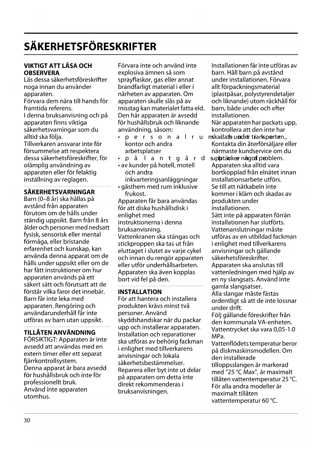 - gästhem med rum inklusive frukost. Apparaten får bara användas för att diska hushållsdisk i enlighet med instruktionerna i denna bruksanvisning. Vattenkranen ska stängas och stickproppen ska tas ut från eluttaget i slutet av varje cykel och innan du rengör apparaten eller utför underhållsarbeten. Apparaten ska även kopplas bort vid fel på den. INSTALLATION För att hantera och installera produkten krävs minst två personer. Använd skyddshandskar när du packar upp och installerar apparaten. Installation och reparationer ska utföras av behörig fackman i enlighet med tillverkarens anvisningar och lokala säkerhetsbestämmelser. Reparera eller byt inte ut delar på apparaten om detta inte direkt rekommenderas i bruksanvisningen. Installationen får inte utföras av barn. Håll barn på avstånd under installationen. Förvara allt förpackningsmaterial (plastpåsar, polystyrendetaljer och liknande) utom räckhåll för barn, både under och efter installationen. När apparaten har packats upp, kontrollera att den inte har skadats under transporten. Kontakta din återförsäljare eller närmaste kundservice om du upptäcker något problem. Apparaten ska alltid vara bortkopplad från elnätet innan installationsarbete utförs. Se till att nätkabeln inte kommer i kläm och skadas av produkten under installationen. Sätt inte på apparaten förrän installationen har slutförts. Vattenanslutningar måste utföras av en utbildad fackman i enlighet med tillverkarens anvisningar och gällande säkerhetsföreskrifter. Apparaten ska anslutas till vattenledningen med hjälp av en ny slangsats. Använd inte gamla slangsatser. Alla slangar måste fästas ordentligt så att de inte lossnar under drift. Följ gällande föreskrifter från den kommunala VA-enheten. Vattentrycket ska vara 0,05-1.0 MPa. Vattenflödets temperatur beror på diskmaskinsmodellen. Om den installerade tilloppsslangen är markerad med “25 °C Max”, är maximalt tillåten vattentemperatur 25 °C. För alla andra modeller är maximalt tillåten vattentemperatur 60 °C.31 Kapa aldrig slangarna. Doppa aldrig plastlådan innehållande vattenstoppsystemet i vatten på maskiner med vattenstoppsystem. Vänd dig till en återförsäljare om slangarna inte är tillräckligt långa. Försäkra dig om att tillopps- och avloppsslangarna inte är vikta eller igentäppta. Kontrollera att vatten- och avloppsslangarna är täta innan maskinen används första gången. Vid användning ska åtkomst till den bakre väggen vara begränsad på ett hållbart sätt, t.ex. att ställa maskinen mot väggen eller en möbelskiva. När apparaten installeras ska du säkerställa att de fyra fötterna är stabila och står på golvet. Justera dem om nödvändigt och kontrollera att apparaten är helt plan med hjälp av ett vattenpass. Om apparaten installeras i slutet av en rad enheter på så sätt att dess sidopanel är åtkomlig ska gångjärnsområdet täckas över för att undvika risk för krosskada. För diskmaskiner som har ventilationsöppningar längst ned får dessa öppningar inte täckas över med en matta.