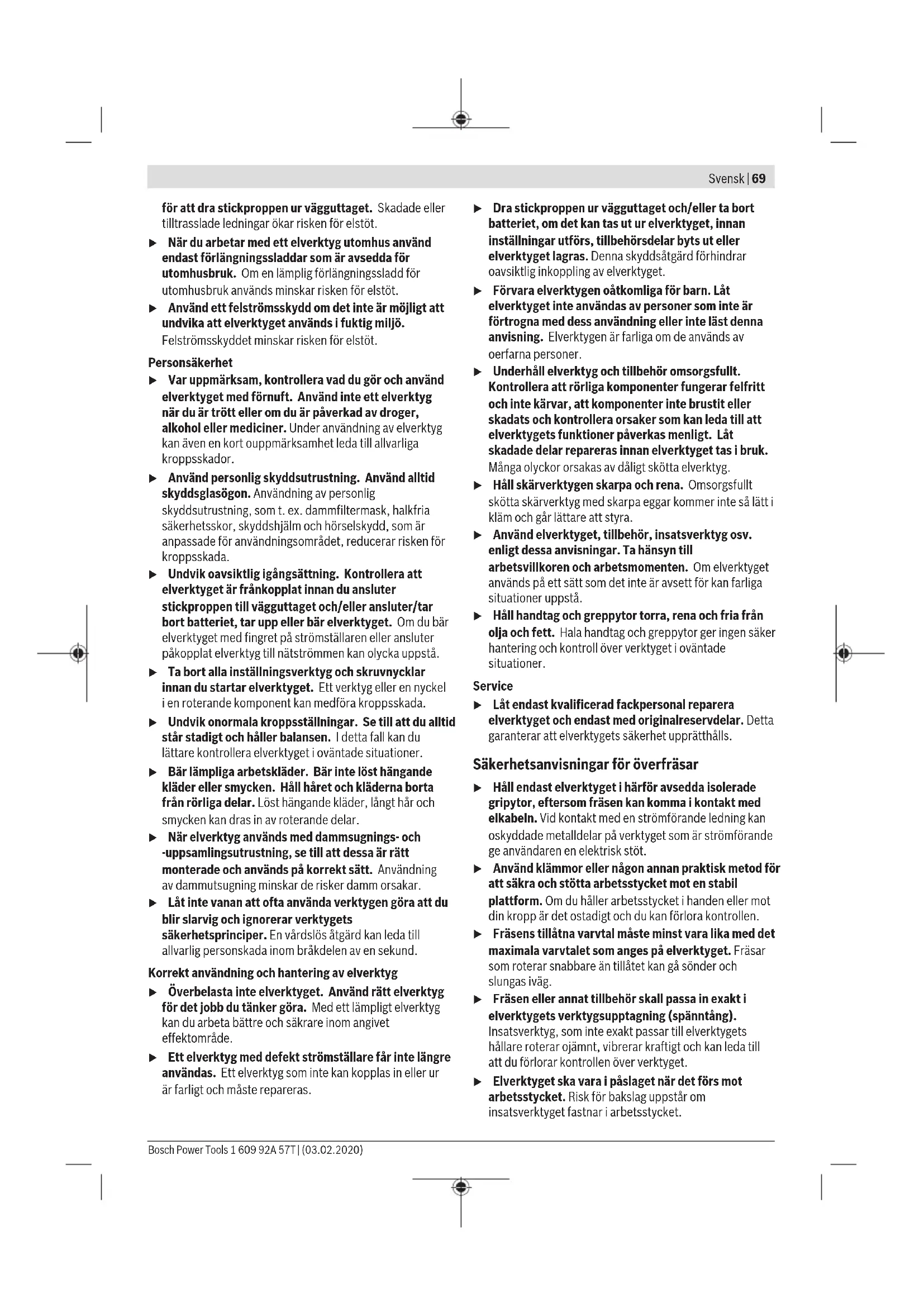 Den vibrationsnivå och det bullervärde som anges i dessa anvisningar har uppmätts enligt en mätmetod som normerats och kan användas för att jämföra elverktyg med varandra. Mätmetoden är även lämplig för preliminär bedömning av vibrations- och bullernivån. Den angivna vibrations- och bullernivån representerar den huvudsakliga användningen av elverktyget. Om däremot elverktyget används för andra ändamål, med andra insatsverktyg eller inte underhållits ordentligt kan vibrations- och bullernivån avvika. Då kan vibrations- och bullernivån under arbetsperioden öka betydligt under hela arbetstiden. För en exakt bedömning av vibrations- och bullernivån bör även de tider beaktas när elverktyget är avstängt eller är igång, men inte används. Detta reducerar vibrations- och bullerbelastningen för den totala arbetsperioden betydligt. Bestäm extra säkerhetsåtgärder för att skydda operatören mot vibrationernas inverkan t.ex.: underhåll av elverktyget och insatsverktygen, att hålla händerna varma, organisation av arbetsförloppen. Montage u Dra stickproppen ur nätuttaget innan arbeten utförs på elverktyget. Sätta in fräsen (sebildA) u För att sätta in och byta fräsar rekommenderas användningen av skyddshandskar. Beroende på användningen finns det fräsar i de mest varierande utförandena och kvaliteterna. Fräsar i HSS-stål är avsedda för bearbetning av mjuka material, som t.ex. mjukt trä och plast. Fräsar med hårdmetalleggar (HM) är avsedda speciellt för hårda och abrasiva material, som t.ex. hårt trä och aluminium. Originalfräsar ur Boschs omfattande tillbehörsprogram får du hos din fackhandlare. Använd bara felfria och rena fräsar. Bosch Power Tools 1 609 92A 57T | (03.02.2020)72 | Svensk – Vrid spindellåsspaken(6) motsols till anslag (➊). Vrid ev. motorspindeln för hand tills den klickar fast. – Lossa överfallsmuttern(4) med U-nyckeln(31) (nyckelvidd 19 mm) genom att vrida den motsols (➋). – Skjut in fräsen i chucken. Fräsens skaft måste skjutas in till markeringen i chucken. – Dra åt överfallsmuttern(4) med U-nyckeln(31) (nyckelbredd 19 mm) genom att vrida den medsols. Stäng spindellåsspaken(6) helt. u För fräsverktyg med en diameter över50mm måste kopierhylsan vara monterad. Denna fräs passar inte genom grundplattan. u Dra inte åt spänntången med huvmuttern så länge ingen fräs är monterad. I annat fall kan spänntången skadas. Damm-/spånutsugning Dammet från material som t.ex. blyhaltig målning, vissa träslag, mineraler och metall kan vara hälsovådligt. Beröring eller inandning av dammet kan orsaka allergiska reaktioner och/eller andningsbesvär hos användaren eller personer som uppehåller sig i närheten. Vissa damm från ek eller bok anses vara cancerogena, speciellt då i förbindelse med tillsatsämnen för träbehandling (kromat, träkonserveringsmedel). Endast yrkesmän får bearbeta asbesthaltigt material. – Använd om möjligt en för materialet lämplig dammutsugning. – Se till att arbetsplatsen är väl ventilerad. – Vi rekommenderar ett andningsskydd i filterklass P2. Beakta de föreskrifter som i aktuellt land gäller för bearbetat material. u Undvik dammanhopning på arbetsplatsen. Damm kan lätt självantändas. Ansluta dammutsug (sebildB) Sätt en utsugsslang (Ø 35 mm)(32) (tillbehör) på den monterade utsugsadaptern. Anslut utsugsslangen(32) till en dammsugare (tillbehör). Elverktyget kan anslutas direkt till uttaget på en universalsug från Bosch med fjärrstartsanordning. Denna startas automatiskt vid påslagning av elverktyget. Dammsugaren måste vara lämplig för det material som ska bearbetas. Använd en specialsug för att suga hälsovådligt och cancerframkallande eller torrt damm. Drift u Beakta nätspänningen! Kontrollera att strömkällans spänning överensstämmer med uppgifterna på elverktygets typskylt. Elverktyg märkta med 230V kan även anslutas till 220V. Driftstart GOF 1250 LCE: efter att strömmen kopplats till lyser ljusringen(3) fast för belysning på arbetsstyckets yta. Sätt in batteriet (se „Byta batteri (GOF1250LCE) (sebildM)“, Sidan74). Vid vissa utföranden är batteriet redan isatt. Ta bort sigillet från batteriet för att aktivera det. Ställ in önskad måttenhet med knappen(17). Förval av varvtal Med reglaget för varvtalsförval(28) kan du välja det varvtal du behöver, även under drift. 1–2 Lågt varvtal 3–4 Medelhögt varvtal 5–6 Högt varvtal I tabellen anges riktvärden. Det varvtal som krävs beror på materialet och arbetsvillkoren och kan förmedlas genom praktiskt försök. Material Fräsdiameter [mm] Reglagets läge Hårt trä (bok) 4–10 12–20 22–40 5–6 3–4 1–2 Mjukt trä (tall) 4–10 12–20 22–40 5–6 3–6 1–3 Spånplattor 4–10 12–20 22–40 3–6 2–4 1–3 Plaster 4–15 16–40 2–3 1–2 Aluminium 4–15 16–40 1–2