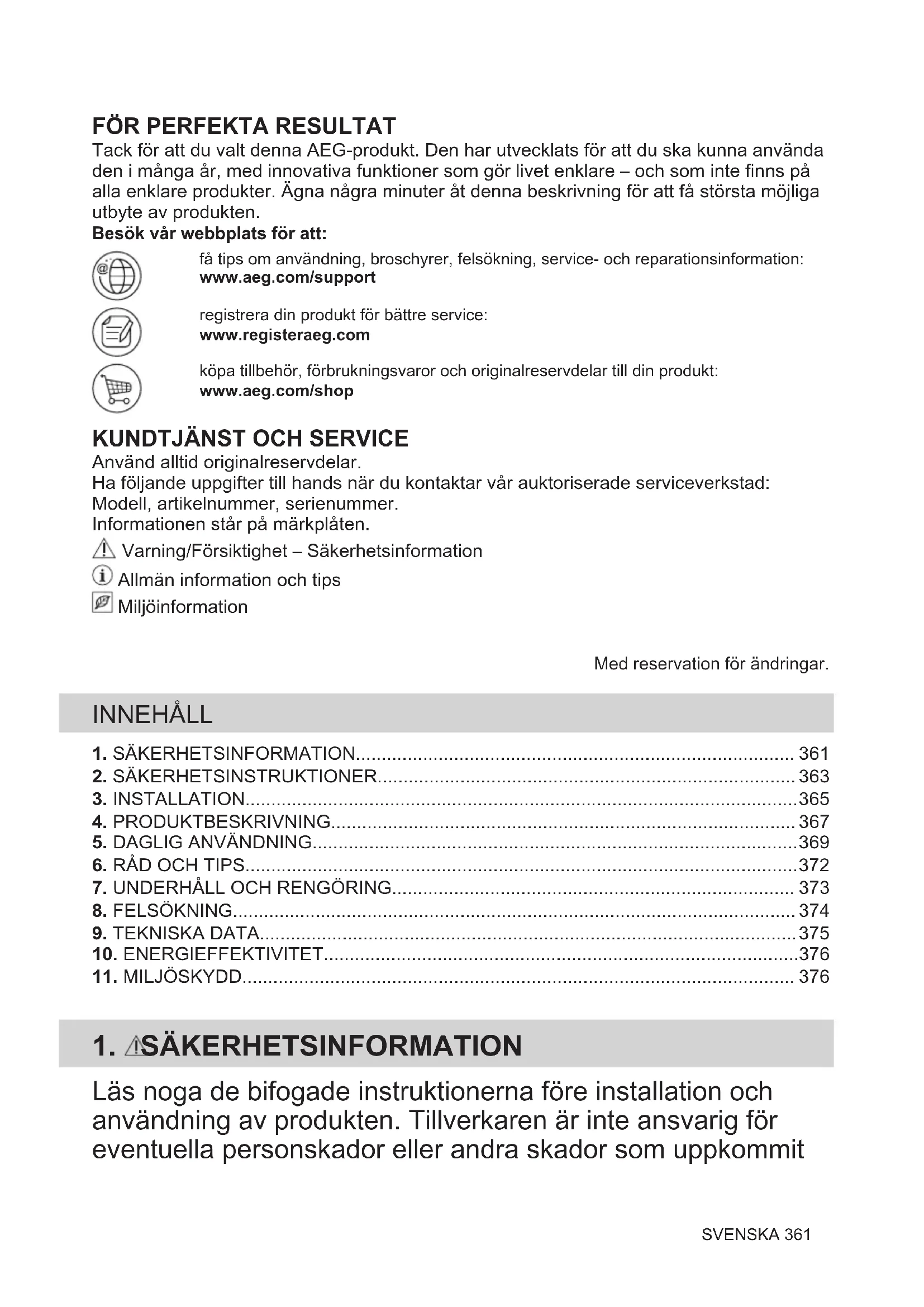 Tack för att du valt denna AEG-produkt. Den har utvecklats för att du ska kunna använda den i många år, med innovativa funktioner som gör livet enklare – och som inte finns på alla enklare produkter. Ägna några minuter åt denna beskrivning för att få största möjliga utbyte av produkten. Besök vår webbplats för att:få tips om användning, broschyrer, felsökning, service- och reparationsinformation:www.aeg.com/supportregistrera din produkt för bättre service:www.registeraeg.comköpa tillbehör, förbrukningsvaror och originalreservdelar till din produkt:www.aeg.com/shop