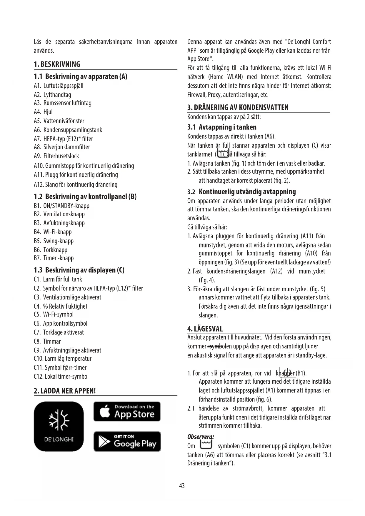 Denna apparat kan användas även med "De'Longhi Comfort APP" som är tillgänglig på Google Play eller kan laddas ner från App Store®. För att få tillgång till alla funktionerna, krävs ett lokal Wi-Fi nätverk (Home WLAN) med Internet åtkomst. Kontrollera dessutom att det inte nns några hinder för Internet-åtkomst: Firewall, Proxy, autentiseringar, etc.