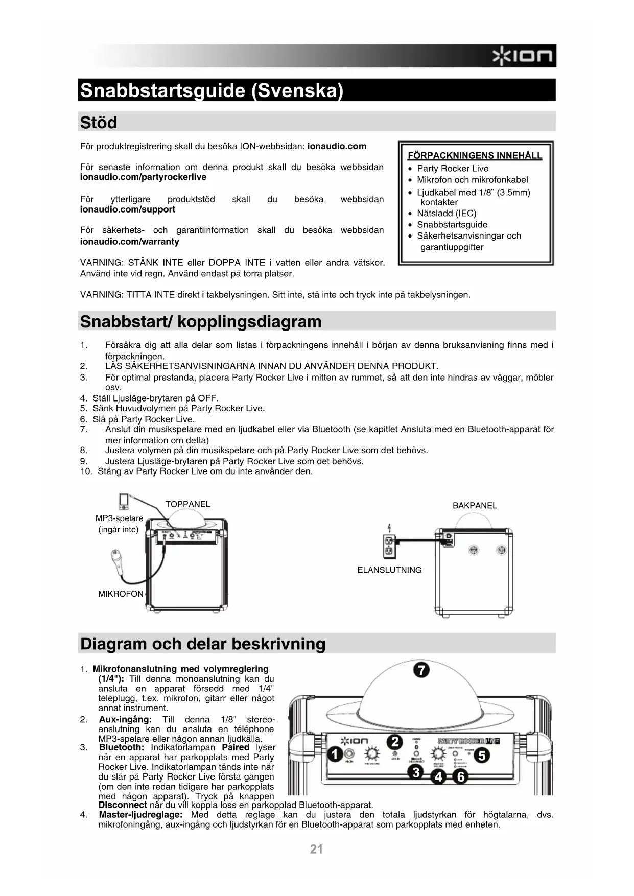- Beat Sync vs. Auto modus21 Snabbstartsguide (Svenska) Stöd För produktregistrering skall du besöka ION-webbsidan: ionaudio.com För senaste information om denna produkt skall du besöka webbsidan ionaudio.com/partyrockerlive För ytterligare produktstöd skall du besöka webbsidan ionaudio.com/support För säkerhets- och garantiinformation skall du besöka webbsidan ionaudio.com/warranty VARNING: STÄNK INTE eller DOPPA INTE i vatten eller andra vätskor. Använd inte vid regn. Använd endast på torra platser. VARNING: TITTA INTE direkt i takbelysningen. Sitt inte, stå inte och tryck inte på takbelysningen. Snabbstart/ kopplingsdiagram