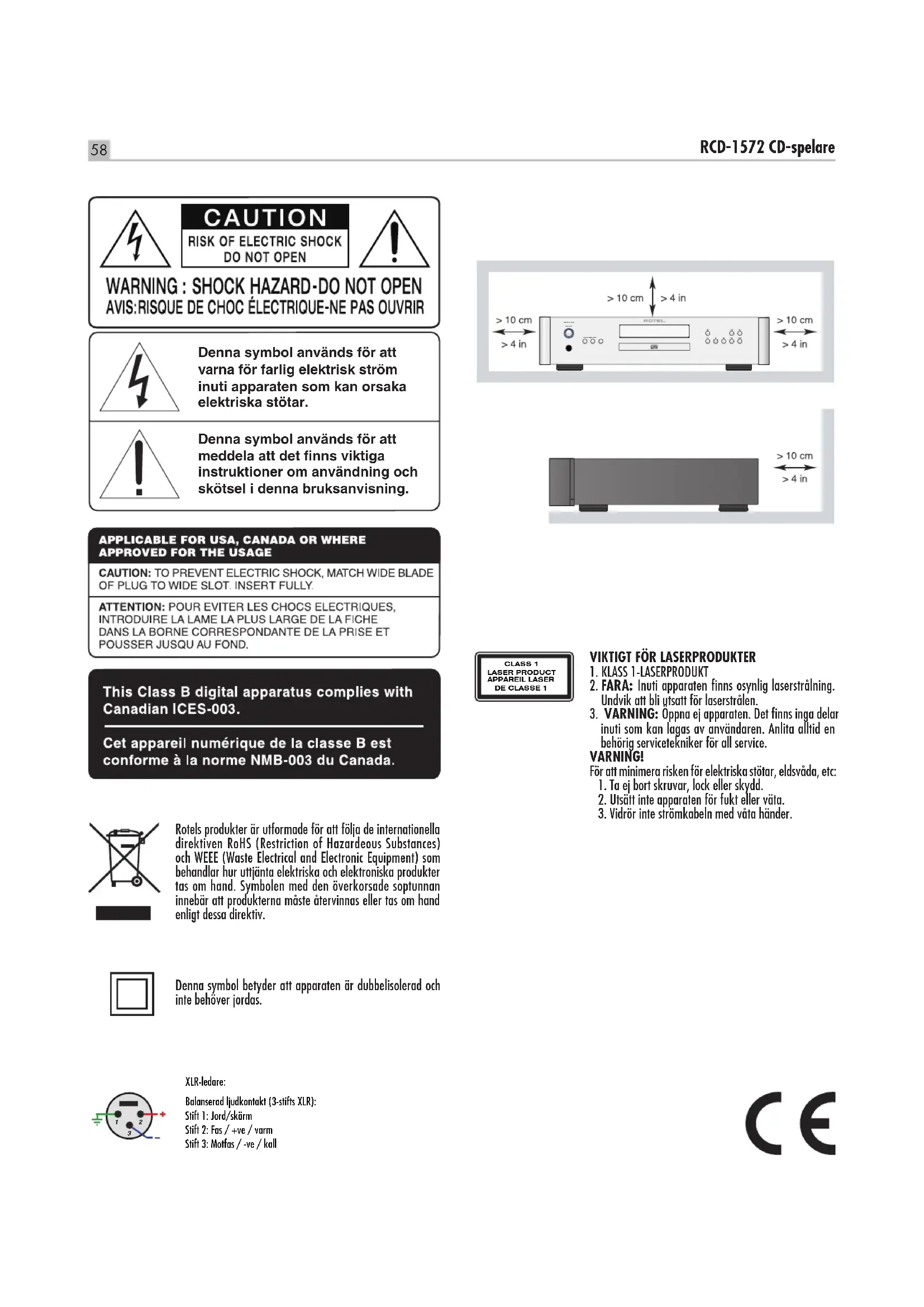 är tillfälliga och sparas inte när RCD-1572 stängs av. Felsökning De esta problem som uppstår i en anläggning beror på felaktiga anslutningar eller inställningar. Om du stöter på problem försöker du lokalisera felet och kontrollerar dina inställningar. Försök hitta orsaken till felet och gör sedan de ändringar som behövs. Om du inte får något ljud ur RCD-1572 så kommer här ett par förslag på vad du kan göra: Strömindikatorn lyser inte Denna indikator och displayen ska alltid lysa när RCD-1572 är ansluten till ett vägguttag och strömbrytaren är intryckt. Om den inte lyser kan du prova om vägguttaget fungerar genom att koppla in någon annan elektrisk apparat, till exempel en lampa. Försäkra dig också om att uttaget inte styrs av en timer eller någon annan utrustning. Säkring Om en annan elektrisk apparat fungerar när den ansluts till vägguttaget, men displayen inte tänds när RCD-1572 ansluts och strömbrytaren trycks in, kan det bero på att CD-spelarens inre säkring har löst ut. Om du misstänker att detta kan vara felet så kontaktar du din auktoriserade Rotel-återförsäljare och ber dem hjälpa dig att byta ut den. Inget ljud hörs Kontrollera signalkabeln mellan RCD-1572 och förstärkaren och försäkra dig om att kontakterna sitter ordentligt fast. Kontrollera också att ingångsväljaren och Tape Monitor-knappen står i rätt lägen på förstärkaren, samt att högtalarkablarna är rätt anslutna. Specikationer Total harmonisk förvrängning (THD) + brus 0.002% vid 1 kHzFrekvensomfång (± 0,5 dB) 20 - 20 000 HzKanalbalans ± 0,5 dBKanalseparation > 115 dB vid vid 10 kHzSignal/brus-förhållande (IHF A) > 118 dBDynamikomfång > 99 dBD/A-omvandlare Wolfson 24 bit / 192 kHz DACImpedans för analogutgång Obalanserad (RCA) 2,2 volt / 100 ohm Balanserad (XLR) 4,4 volt / 200 ohmDigital utsignal 0,5 volt, (Peak to Peak)Belastningsimpedans 75 ohmStrömförsörjning Europa 230 volt, 50 Hz USA 120 volt, 60 HzStrömförbrukning 15 WattStrömförbrukning standby < 0,5 WattMått (B x H x D) 431 x 104 x 320 mm.Fronthöjd 2U/88,1 mmVikt (netto) 6,7 kg Alla specikationer är korrekta vid tryckningen. Rotel förbehåller sig rätten att göra förbättringar utan föregående meddelanden. Rotel och Rotels HiFi-logotyp är registrerade varumärken som tillhör The Rotel Co, Ltd., Tokyo, Japan.65 RCD-1572 СD-проигрыватель Изделия Rotel спроектированы для соответствия международным предписаниям на ограничение опасных веществ (RoHS) в электрическом и электронном оборудовании и утилизации этого оборудования (WEEE). Символ перечеркнутого мусорного бака указывает на соответствие и на то, что все изделия должны быть переработаны должным образом или обработаны в соответствии с этими предписаниями. Данный символ означает, что это изделие имеет двойную изоляцию. Заземление не требуется. Этот цифровой аппарата класса B соответствует требованиям канадского стандарта ICES-003. ДЛЯ США, КАНАДЫ И ДРУГИХ СТРАН, ГДЕ УСТРОЙСТВО ОДОБРЕНО К ИСПОЛЬЗОВАНИЮ. Изображение молнии в равностороннем треугольнике предупреждает пользователя о наличии внутри корпуса изделия неизолированного напряжения, величина которого может создавать опасность поражения человека электрическим током.Изображение восклицательного знака в равностороннем треугольнике предупреждает пользователя о наличии в сопровождающей аппарат документации важных инструкций по эксплуатации и техническому обслуживанию. ВАЖНЫЕ ЗАМЕЧАНИЯ ОТНОСИТЕЛЬНО ЛАЗЕРА