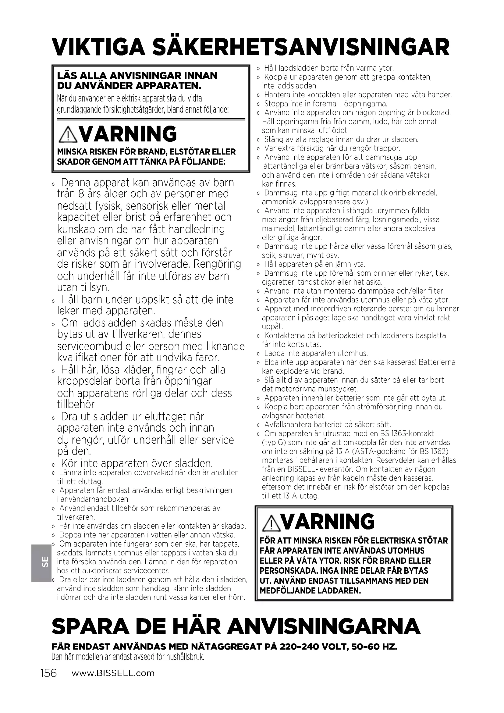 DUANVÄNDER APPARATEN. När du använder en elektrisk apparat ska du vidta grundläggande försiktighetsåtgärder, bland annat följande: VARNING MINSKA RISKEN FÖR BRAND, ELSTÖTAR ELLER SKADOR GENOM ATT TÄNKA PÅ FÖLJANDE:» Denna apparat kan användas av barn från 8 års ålder och av personer med nedsatt fysisk, sensorisk eller mental kapacitet eller brist på erfarenhet och kunskap om de har fått handledning eller anvisningar om hur apparaten används på ett säkert sätt och förstår derisker som är involverade. Rengöring och underhåll får inte utföras av barn utan tillsyn. » Håll barn under uppsikt så att de inte leker med apparaten. » Om laddsladden skadas måste den bytas ut av tillverkaren, dennes serviceombud eller person med liknande kvalifikationer för att undvika faror. » Håll hår, lösa kläder, fingrar och alla kroppsdelar borta från öppningar och apparatens rörliga delar och dess tillbehör. » Dra ut sladden ur eluttaget när apparaten inte används och innan durengör, utför underhåll eller service på den. » Kör inte apparaten över sladden.» Lämna inte apparaten oövervakad när den är ansluten tillett eluttag.» Apparaten får endast användas enligt beskrivningen ianvändarhandboken.» Använd endast tillbehör som rekommenderas av tillverkaren.» Får inte användas om sladden eller kontakten är skadad.» Doppa inte ner apparaten i vatten eller annan vätska.» Om apparaten inte fungerar som den ska, har tappats, skadats, lämnats utomhus eller tappats i vatten ska du inte försöka använda den. Lämna in den för reparation hos ett auktoriserat servicecenter.» Dra eller bär inte laddaren genom att hålla den i sladden, använd inte sladden som handtag, kläm inte sladden idörrar och dra inte sladden runt vassa kanter eller hörn.» Håll laddsladden borta från varma ytor.» Koppla ur apparaten genom att greppa kontakten, inteladdsladden.» Hantera inte kontakten eller apparaten med våta händer.» Stoppa inte in föremål i öppningarna.» Använd inte apparaten om någon öppning är blockerad. Håll öppningarna fria från damm, ludd, hår och annat somkan minska luftflödet.» Stäng av alla reglage innan du drar ur sladden.» Var extra försiktig när du rengör trappor.» Använd inte apparaten för att dammsuga upp lättantändliga eller brännbara vätskor, såsom bensin, ochanvänd den inte i områden där sådana vätskor kanfinnas.» Dammsug inte upp giftigt material (klorinblekmedel, ammoniak, avloppsrensare osv.).» Använd inte apparaten i stängda utrymmen fyllda med ångor från oljebaserad färg, lösningsmedel, vissa malmedel, lättantändligt damm eller andra explosiva ellergiftiga ångor.» Dammsug inte upp hårda eller vassa föremål såsom glas, spik, skruvar, mynt osv.» Håll apparaten på en jämn yta.» Dammsug inte upp föremål som brinner eller ryker, t.ex. cigaretter, tändstickor eller het aska.» Använd inte utan monterad dammpåse och/eller filter.» Apparaten får inte användas utomhus eller på våta ytor.» Apparat med motordriven roterande borste: om du lämnar apparaten i påslaget läge ska handtaget vara vinklat rakt uppåt.» Kontakterna på batteripaketet och laddarens basplatta fårinte kortslutas.» Ladda inte apparaten utomhus.» Elda inte upp apparaten när den ska kasseras! Batterierna kan explodera vid brand.» Slå alltid av apparaten innan du sätter på eller tar bort detmotordrivna munstycket.» Apparaten innehåller batterier som inte går att byta ut.» Koppla bort apparaten från strömförsörjning innan du avlägsnar batteriet.» Avfallshantera batteriet på säkert sätt.» Om apparaten är utrustad med en BS 1363-kontakt (typG) som inte går att omkoppla får den inte användas om inte en säkring på 13 A (ASTA-godkänd för BS 1362) monteras i behållaren i kontakten. Reservdelar kan erhållas från en BISSELL-leverantör. Om kontakten av någon anledning kapas av från kabeln måste den kasseras, eftersom det innebär en risk för elstötar om den kopplas till ett 13 A-uttag.