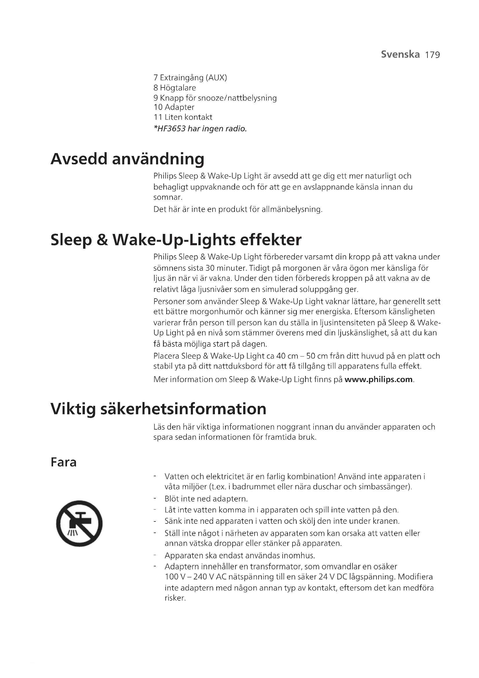 Svenska Innehåll Inledning ________________________________________________________________________________ 178 Allmän beskrivning ________________________________________________________________________ 178 Avsedd användning _______________________________________________________________________ 179 Sleep & Wake-Up-Lights effekter ____________________________________________________________ 179 Viktig säkerhetsinformation ________________________________________________________________ 179 Säkerhet och efterlevnad ___________________________________________________________________ 181 Elektromagnetiska fält (EMF) _______________________________________________________________ 181 Interaktiva menysymboler __________________________________________________________________ 182 Navigera på menyn ________________________________________________________________________ 183 Ställa in väckningsprofiler __________________________________________________________________ 183 Tid + larm-backup _________________________________________________________________________ 184 Snooze___________________________________________________________________________________ 184 Avvisa larmet _____________________________________________________________________________ 184 Använda Sleep & Wake-Up Light som sänglampa. _____________________________________________ 185 Nattbelysning_____________________________________________________________________________ 185 Inställningar ______________________________________________________________________________ 185 Musik ____________________________________________________________________________________ 187 Avkopplingsprogram ______________________________________________________________________ 188 Ladda mobiltelefonen _____________________________________________________________________ 189 Rengöring och förvaring ___________________________________________________________________ 189 Återvinning_______________________________________________________________________________ 189 Garanti och support _______________________________________________________________________ 189 Felsökning________________________________________________________________________________ 190 Programvara med öppen källkod och programvara från tredje part ______________________________ 192 Specifikationer ____________________________________________________________________________ 192 Inledning Grattis till ditt inköp och välkommen till Philips! Få ut mesta möjliga av den support Philips erbjuder genom att registrera din produkt på www.philips.com/welcome. Philips Sleep & Wake-Up Light hjälper dig att vakna på ett behagligare sätt. Om soluppgångssimuleringen är aktiv ökas lampans ljusstyrka gradvis till den inställda nivån och ljusfärgen ändras från djupt morgonrött till starkt dagsljus. Ljuset förbereder försiktigt din kropp för att vakna vid den inställda tiden. Du kan göra det ännu behagligare att vakna genom att använda naturliga väckningsljud eller FM-radion*. *HF3653 har ingen radio. Allmän beskrivning 1 Lamphölje 2 Teckenfönster 3 USB-laddningsport 4 Återställningsknapp 5 Radioantenn* 6 Adapterns DC-uttag179 Svenska 7 Extraingång (AUX) 8 Högtalare 9 Knapp för snooze/nattbelysning 10 Adapter 11 Liten kontakt *HF3653 har ingen radio. Avsedd användning Philips Sleep & Wake-Up Light är avsedd att ge dig ett mer naturligt och behagligt uppvaknande och för att ge en avslappnande känsla innan du somnar. Det här är inte en produkt för allmänbelysning. Sleep & Wake-Up-Lights effekter Philips Sleep & Wake-Up Light förbereder varsamt din kropp på att vakna under sömnens sista 30 minuter. Tidigt på morgonen är våra ögon mer känsliga för ljus än när vi är vakna. Under den tiden förbereds kroppen på att vakna av de relativt låga ljusnivåer som en simulerad soluppgång ger. Personer som använder Sleep & Wake-Up Light vaknar lättare, har generellt sett ett bättre morgonhumör och känner sig mer energiska. Eftersom känsligheten varierar från person till person kan du ställa in ljusintensiteten på Sleep & Wake- Up Light på en nivå som stämmer överens med din ljuskänslighet, så att du kan få bästa möjliga start på dagen. Placera Sleep & Wake-Up Light ca 40cm –50cm från ditt huvud på en platt och stabil yta på ditt nattduksbord för att få tillgång till apparatens fulla effekt. Mer information om Sleep & Wake-Up Light finns på www.philips.com. Viktig säkerhetsinformation Läs den här viktiga informationen noggrant innan du använder apparaten och spara sedan informationen för framtida bruk. Fara