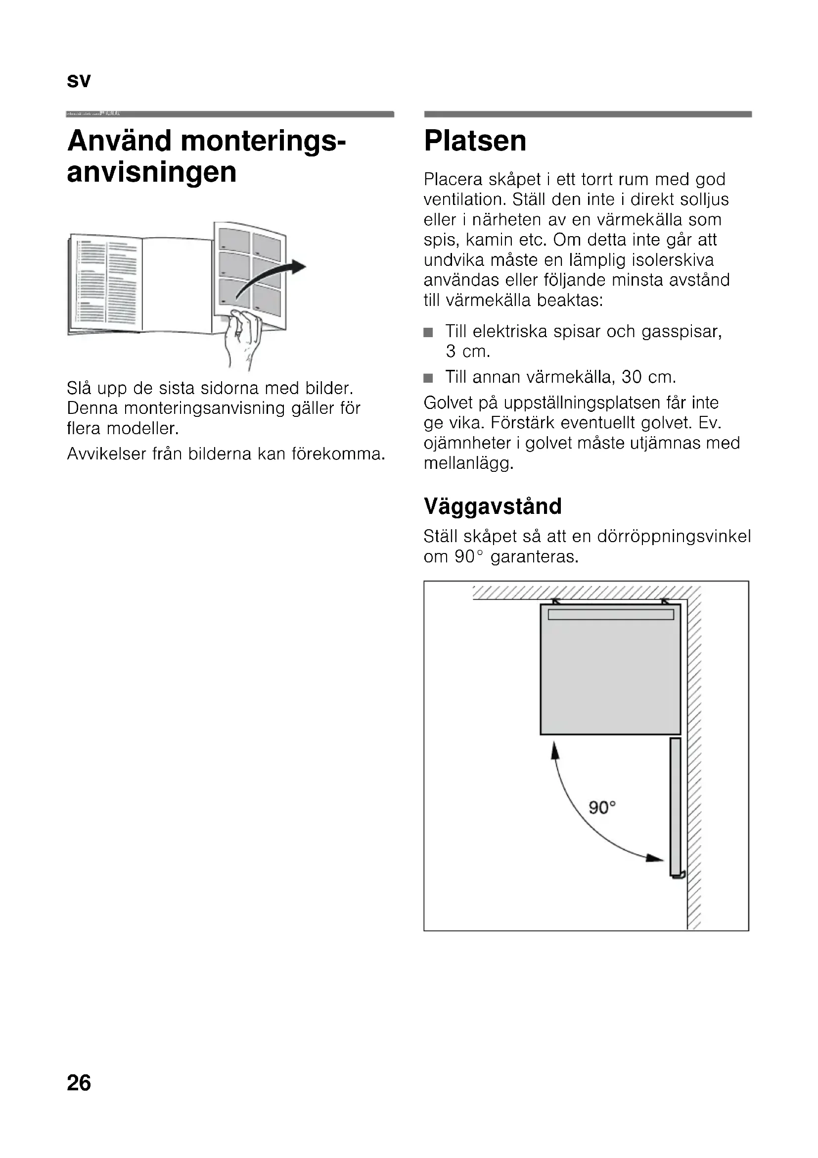 svIn nehål lsförte ckning svMonterin gsanvis ning Fristående skåp Använd monterings- anvisningen Slå upp de sista sidorna med bilder. Denna monteringsanvisning gäller för flera modeller. Avvikelser från bilderna kan förekomma. Platsen Placera skåpet i ett torrt rum med god ventilation. Ställ den inte i direkt solljus eller i närheten av en värmekälla som spis, kamin etc. Om detta inte går att undvika måste en lämplig isolerskiva användas eller följande minsta avstånd till värmekälla beaktas: ■ Till elektriska spisar och gasspisar, 3cm. ■ Till annan värmekälla, 30 cm. Golvet på uppställningsplatsen får inte ge vika. Förstärk eventuellt golvet. Ev. ojämnheter i golvet måste utjämnas med mellanlägg. Väggavstånd Ställ skåpet så att en dörröppningsvinkel om 90° garanteras.sv