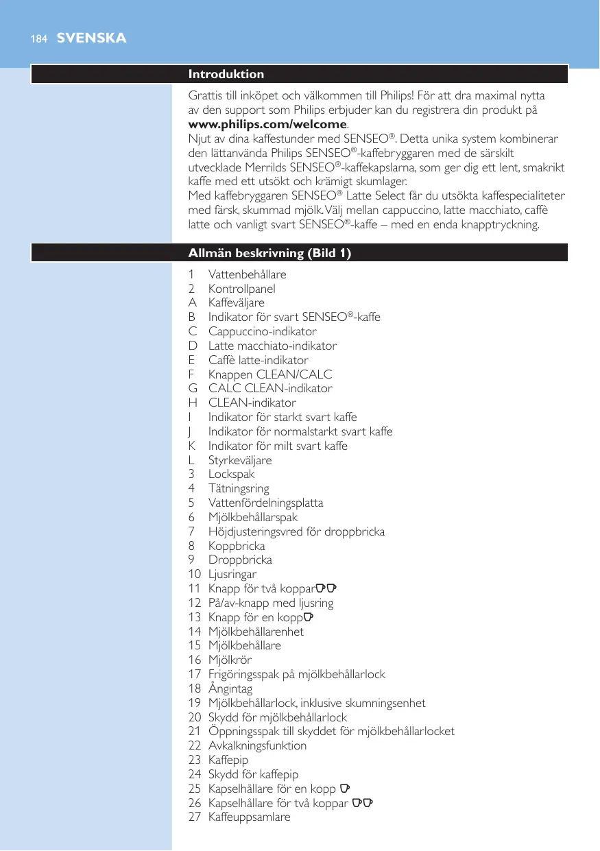 SVENSKA Introduktion Grattis till inköpet och välkommen till Philips! För att dra maximal nytta av den support som Philips erbjuder kan du registrera din produkt på www.philips.com/welcome. Njut av dina kaffestunder med SENSEO®. Detta unika system kombinerar den lättanvända Philips SENSEO®-kaffebryggaren med de särskilt utvecklade Merrilds SENSEO®-kaffekapslarna, som ger dig ett lent, smakrikt kaffe med ett utsökt och krämigt skumlager. Med kaffebryggaren SENSEO® Latte Select får du utsökta kaffespecialiteter med färsk, skummad mjölk. Välj mellan cappuccino, latte macchiato, caffè latte och vanligt svart SENSEO®-kaffe – med en enda knapptryckning. Allmän beskrivning (Bild 1) 1 2 A B C D E F G H I J K L 3 4 5 6 7 8 9 10 11 12 13 14 15 16 17 18 19 20 21 22 23 24 25 26 27