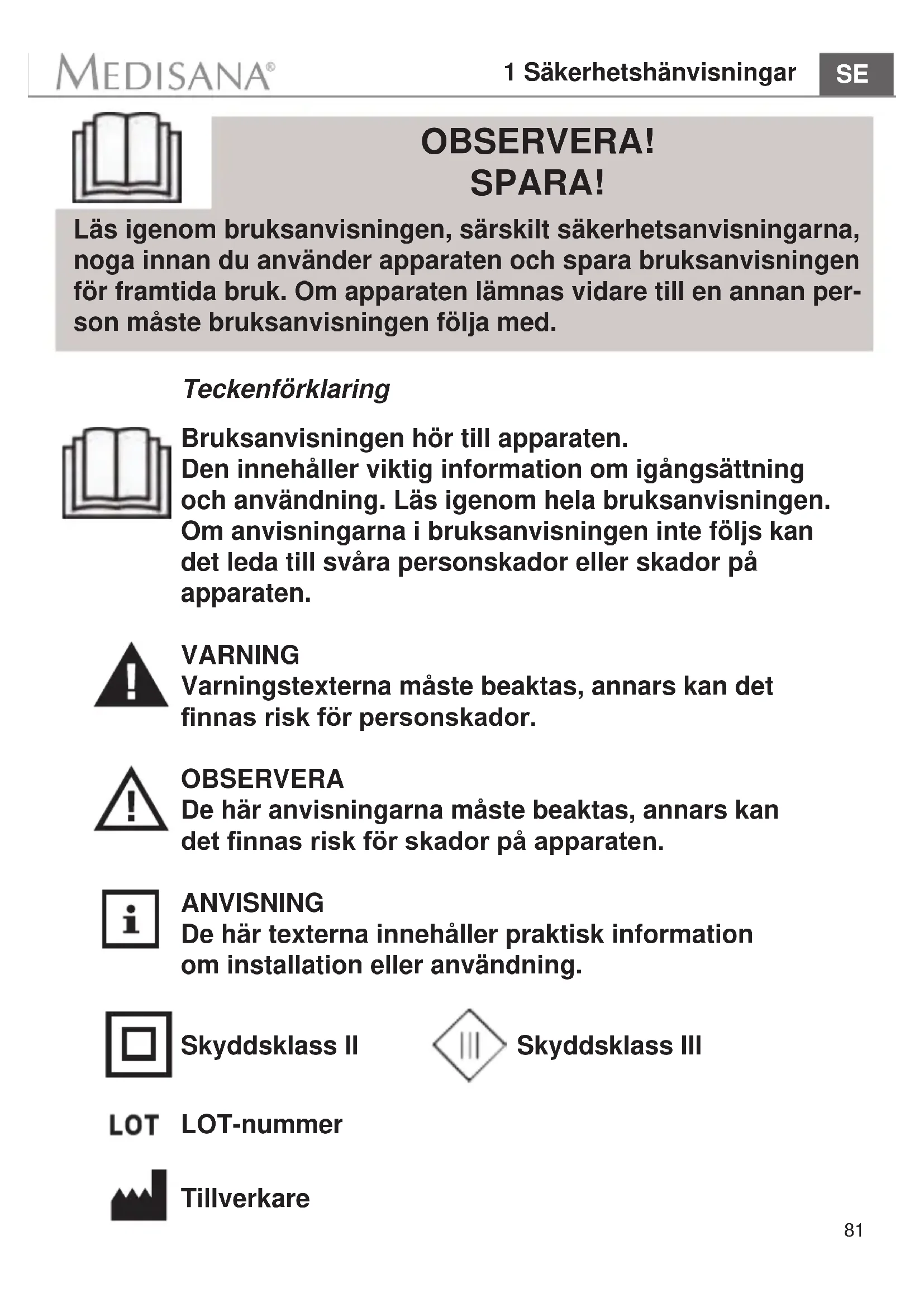 OBSERVERA! SPARA! Läs igenom bruksanvisningen, särskilt säkerhetsanvisningarna, noga innan du använder apparaten och spara bruksanvisningen för framtida bruk. Om apparaten lämnas vidare till en annan per- son måste bruksanvisningen följa med. Teckenförklaring Bruksanvisningen hör till apparaten. Den innehåller viktig information om igångsättning och användning. Läs igenom hela bruksanvisningen. Om anvisningarna i bruksanvisningen inte följs kan det leda till svåra personskador eller skador på apparaten. VARNING Varningstexterna måste beaktas, annars kan det nnas risk för personskador. OBSERVERA De här anvisningarna måste beaktas, annars kan det nnas risk för skador på apparaten. ANVISNING De här texterna innehåller praktisk information om installation eller användning. Skyddsklass II Skyddsklass III LOT-nummer Tillverkare82 1 Säkerhetshänvisningar