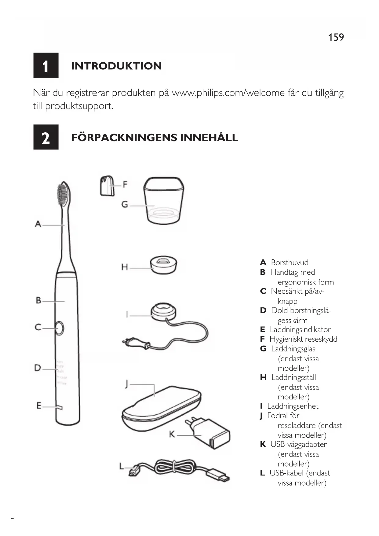FörPaCkningenS innehåll a Borsthuvud B Handtag med ergonomisk form C Nedsänkt på/av- knapp D Dold borstningslä- gesskärm e Laddningsindikator F Hygieniskt reseskydd g Laddningsglas (endast vissa modeller) h Laddningsställ (endast vissa modeller) i Laddningsenhet J Fodralför reseladdare (endast vissamodeller) k USB-väggadapter (endast vissa modeller) l USB-kabel (endast vissamodeller)160