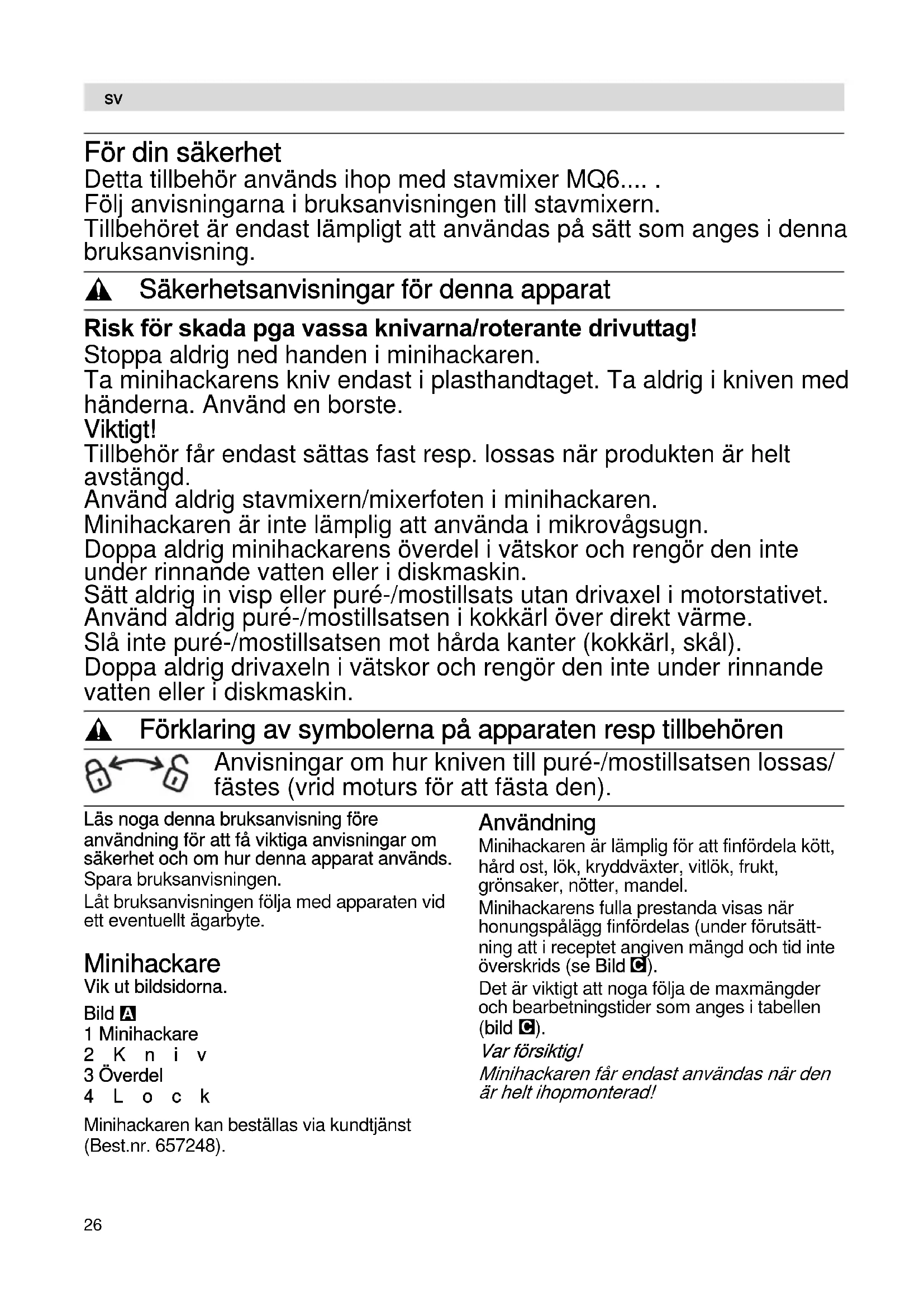 Endringer forbeholdes.26 För din säkerhet Detta tillbehör används ihop med stavmixer MQ6.... . Följ anvisningarna i bruksanvisningen till stavmixern. Tillbehöret är endast lämpligt att användas på sätt som anges i denna bruksanvisning. , Säkerhetsanvisningar för denna apparat Risk för skada pga vassa knivarna/roterante drivuttag! Stoppa aldrig ned handen i minihackaren. Ta minihackarens kniv endast i plasthandtaget. Ta aldrig i kniven med händerna. Använd en borste. Viktigt! Tillbehör får endast sättas fast resp. lossas när produkten är helt avstängd. Använd aldrig stavmixern/mixerfoten i minihackaren. Minihackaren är inte lämplig att använda i mikrovågsugn. Doppa aldrig minihackarens överdel i vätskor och rengör den inte under rinnande vatten eller i diskmaskin. Sätt aldrig in visp eller puré-/mostillsats utan drivaxel i motorstativet. Använd aldrig puré-/mostillsatsen i kokkärl över direkt värme. Slå inte puré-/mostillsatsen mot hårda kanter (kokkärl, skål). Doppa aldrig drivaxeln i vätskor och rengör den inte under rinnande vatten eller i diskmaskin. , Förklaring av symbolerna på apparaten resp tillbehören Anvisningar om hur kniven till puré-/mostillsatsen lossas/ fästes (vrid moturs för att fästa den). Läs noga denna bruksanvisning före användning för att få viktiga anvisningar om säkerhet och om hur denna apparat används.Spara bruksanvisningen.Låt bruksanvisningen följa med apparaten vid ett eventuellt ägarbyte. Minihackare Vik ut bildsidorna.Bild 1 Minihackare2Kniv3 Överdel4LockMinihackaren kan beställas via kundtjänst (Best.nr. 657248). Användning Minihackaren är lämplig för att finfördela kött, hård ost, lök, kryddväxter, vitlök, frukt, grönsaker, nötter, mandel. Minihackarens fulla prestanda visas när honungspålägg finfördelas (under förutsätt-ning att i receptet angiven mängd och tid inte överskrids (se Bild ).Det är viktigt att noga följa de maxmängder och bearbetningstider som anges i tabellen (bild ). Var försiktig!Minihackaren får endast användas när den är helt ihopmonterad! sv27 Varning! Ta först bort brosk, ben och senor från kött. Minihackaren är inte lämplig att finfördela mycket hårda produkter med (kaffebönor, rättika, muskotnötter) och inte heller frysta produkter (frukt och liknande). Bild Ställ minihackaren på plan, ren yta och tryck fast den. Sätt försiktigt i kniven. Lägg i livsmedlet. Var försiktig! Kniven måste sitta rakt i minihackaren för att överdelen ska kunna sitta fast på rätt sätt (bild=