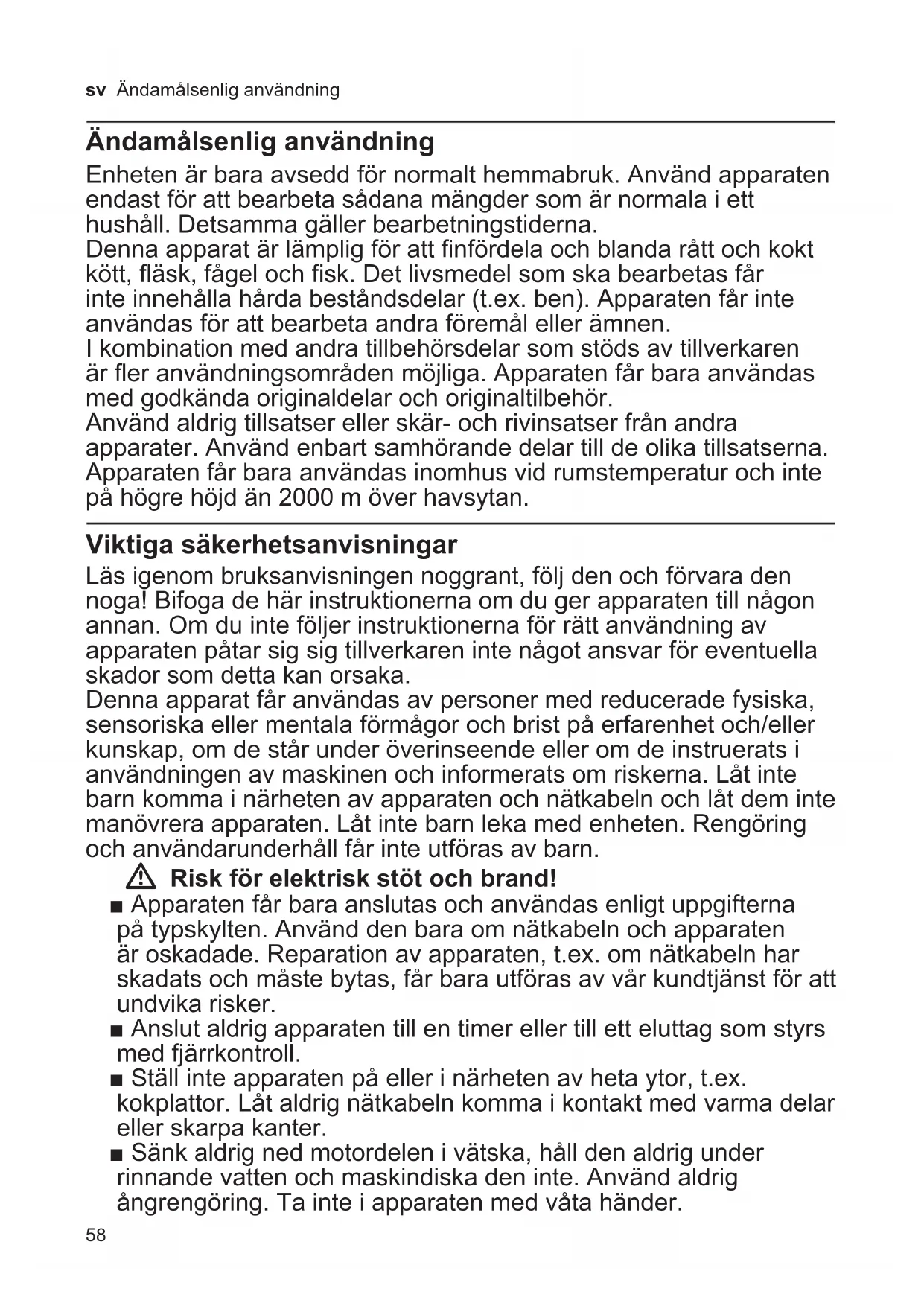 Vennligst kast innpakningsmaterialet på en miljø- og forskriftsmessig måte. Dette apparatet er klassifisert i henhold til det europeiske direk- tivet 2012/19/EU om avhending av elektrisk- og elektronisk utstyr (waste electrical and electronic equipment – WEEE). Direktivet angir rammene for innlevering og gjenvinning av innbytteprodukter. Faghandelen kan gi opplysninger om aktuelle avfallsmottak. Garanti For dette apparatet gjelder de garantibe- tingelser som er oppgitt av vår representant i de respektive land. Detaljer om disse garantibetingelsene får du ved å henvende deg til elektrohandelen der du har kjøpt apparatet. Ved krav i forbindelse med garantiytelser, er det i alle fall nødvendig å legge fram kvittering for kjøpet av apparatet. Det tas forbehold om endringer.58 sv Ändamålsenlig användning Ändamålsenlig användning Enheten är bara avsedd för normalt hemmabruk. Använd apparaten endast för att bearbeta sådana mängder som är normala i ett hushåll. Detsamma gäller bearbetningstiderna. Denna apparat är lämplig för att finfördela och blanda rått och kokt kött, fläsk, fågel och fisk. Det livsmedel som ska bearbetas får inte innehålla hårda beståndsdelar (t.ex. ben). Apparaten får inte användas för att bearbeta andra föremål eller ämnen. I kombination med andra tillbehörsdelar som stöds av tillverkaren är fler användningsområden möjliga. Apparaten får bara användas med godkända originaldelar och originaltilbehör. Använd aldrig tillsatser eller skär- och rivinsatser från andra apparater. Använd enbart samhörande delar till de olika tillsatserna. Apparaten får bara användas inomhus vid rumstemperatur och inte på högre höjd än 2000 m över havsytan. Viktiga säkerhetsanvisningar Läs igenom bruksanvisningen noggrant, följ den och förvara den noga! Bifoga de här instruktionerna om du ger apparaten till någon annan. Om du inte följer instruktionerna för rätt användning av apparaten påtar sig sig tillverkaren inte något ansvar för eventuella skador som detta kan orsaka. Denna apparat får användas av personer med reducerade fysiska, sensoriska eller mentala förmågor och brist på erfarenhet och/eller kunskap, om de står under överinseende eller om de instruerats i användningen av maskinen och informerats om riskerna. Låt inte barn komma i närheten av apparaten och nätkabeln och låt dem inte manövrera apparaten. Låt inte barn leka med enheten. Rengöring och användarunderhåll får inte utföras av barn. W Risk för elektrisk stöt och brand! ■ Apparaten får bara anslutas och användas enligt uppgifterna på typskylten. Använd den bara om nätkabeln och apparaten är oskadade. Reparation av apparaten, t.ex. om nätkabeln har skadats och måste bytas, får bara utföras av vår kundtjänst för att undvika risker. ■ Anslut aldrig apparaten till en timer eller till ett eluttag som styrs med fjärrkontroll. ■ Ställ inte apparaten på eller i närheten av heta ytor, t.ex. kokplattor. Låt aldrig nätkabeln komma i kontakt med varma delar eller skarpa kanter. ■ Sänk aldrig ned motordelen i vätska, håll den aldrig under rinnande vatten och maskindiska den inte. Använd aldrig ångrengöring. Ta inte i apparaten med våta händer.59