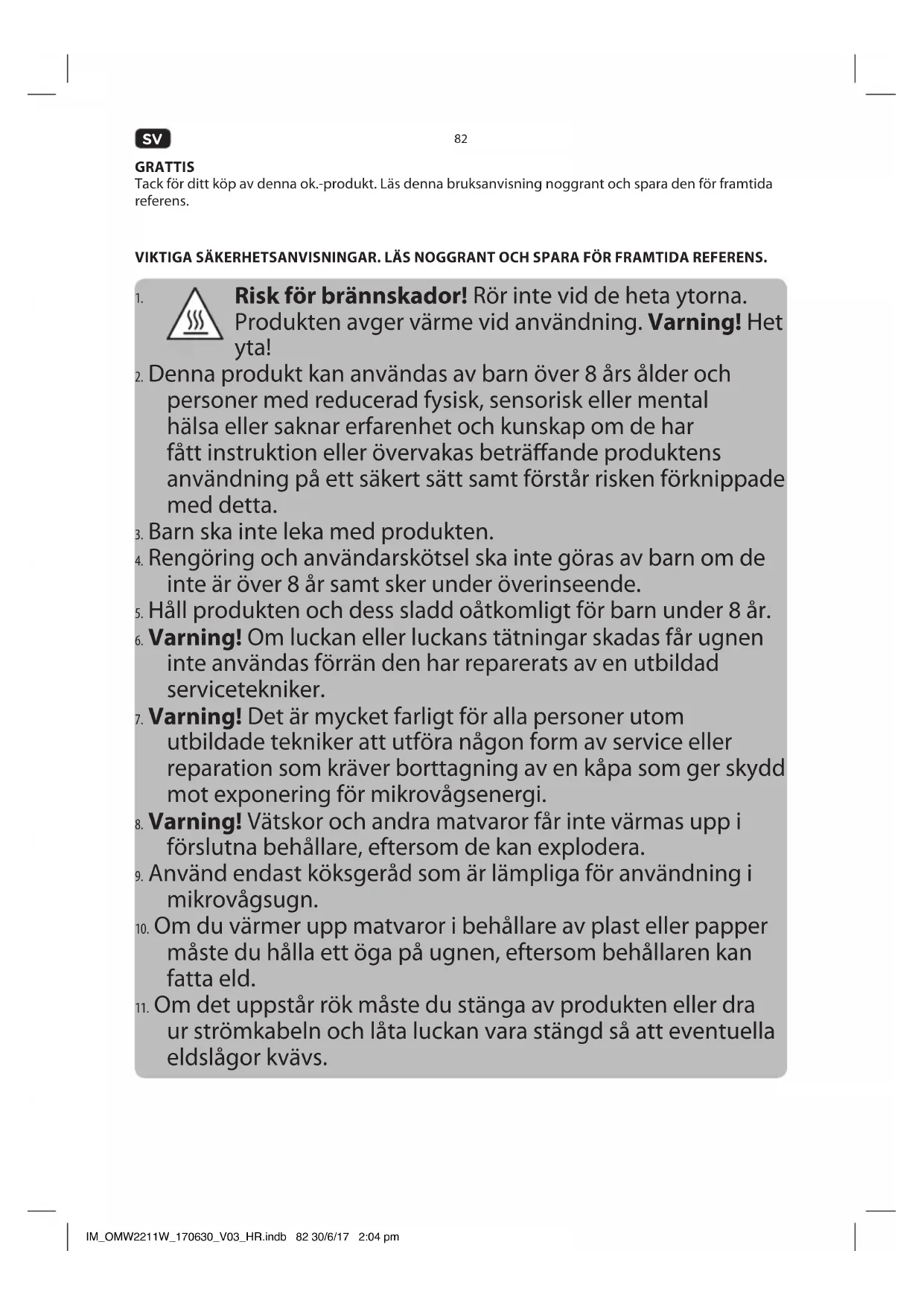 ur strömkabeln och låta luckan vara stängd så att eventuella eldslågor kvävs. IM_OMW2211W_170630_V03_HR.indb 82 30/6/17 2:04 pm83