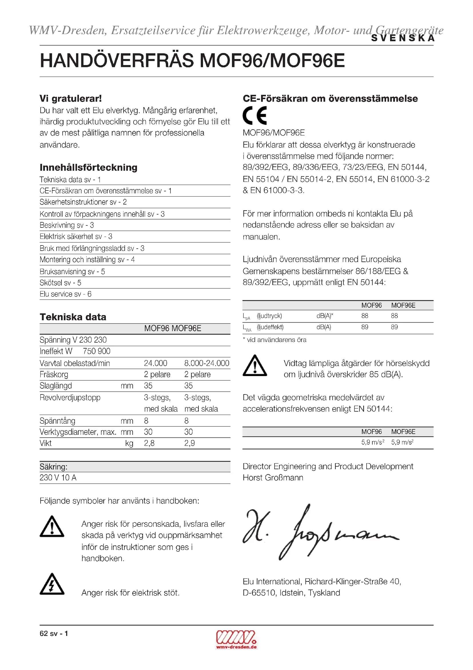Director Engineering and Product Development Horst Großmann Elu International, Richard-Klinger-Straße 40, D-65510, Idstein, Tyskland WMV-Dresden, Ersatzteilservice für Elektrowerkzeuge, Motor- und Gartengerätesv - 2 63 SVENSKA Säkerhetsinstruktioner Innan Du börjar använda maskinen, tag några minuter i anspråk för att läsa igenom bruksanvisningen. Spara bruksanvisningen lättillgängligt, så att alla som använder maskinen har tillgång till bruksanvisningen. Förutom nedanstående instruktioner, följ alltid Arbetarskyddsstyrelsens regler. VARNING! När man använder elverktyg skall dessa grundläggande säkerhetsinstruktioner alltid följas för att minska risken för elektriska stötar, personskada och brand. 1 Använd hörselskydd Ljudnivån vid bearbetning av olika material kan variera, ibland överstiger nivån 85 dB(A). För att skydda Dig själv, använd alltid hörselskydd. 2 Håll arbetsområdet i ordning Nedskräpade ytor och arbetsbänkar inbjuder till skador. 3 Tänk på arbetsmiljöns inverkan Utsätt inte elverktyg för regn. Använd inte elverktyg på fuktiga eller våta platser. Ha bra belysning över arbetsytan. Använd inte elverktyg i närheten av lättantändliga vätskor eller gaser. 4 Skydda Dig mot elektriska stötar Undvik kroppskontakt med jordade delar (t.ex. rör, radiatorer, spisar, kylskåp). Vid extrema arbetsförhållanden (t.ex. hög fuktighet, uppkomst av metalldamm osv.) kan den elektriska säkerheten ökas med koppling av en skiljetransformator eller en jordfelsbrytare. 5 Utom räckhåll för barn Se till att verktyget och sladden förvaras utom räckhåll för barn. Personer under 16 år får inte arbeta med verktyget på egen hand. 6 Förvara verktyg säkert När elverktyget inte används skall det förvaras på ett torrt, högt placerat ställe, inlåst, utom räckhåll för barn. 7 Överbelasta inte elverktyg Du arbetar bättre och säkrare inom det angivna effektsområdet. 8 Använd rätt elverktyg Tvinga inte elverktyget att göra arbeten som är avsedda för kraftigare verktyg. Använd inte elverktyg för ändamål de inte är avsedda för: använd t.ex. inte handcirkelsåg för att såga av kvistar eller vedträ. 9 Klä Dig rätt Bär inte löst hängande kläder eller smycken. De kan fastna i rörliga delar. Gummihandskar och halkfria skor rekommenderas vid utomhusarbeten. Använd hårnät om Du har långt hår. 10 Använd skyddsglasögon Använd skyddsglasögon för att förhindra att damm blåser in i Dina ögon vilket kan förorsaka skada. Om mycket damm uppstår använd även ansiktsmask. 11 Misshandla inte sladden Bär aldrig verktyget i sladden och använd inte sladden för att ta ut kontakten från uttaget. Utsätt inte sladden för hetta, olja eller skarpa kanter. 12 Sätt fast arbetsstycket Använd skruvtvingar eller ett skruvstycke för att hålla fast arbetsstycket. Det är säkrare än att använda handen och Du får bägge händerna fria för arbetet. 13 Sträck Dig inte för mycket Se till att Du alltid har säkert fotfäste och balans. 14 Sköt tillbehören med omsorg Håll tillbehören skarpa och rena. Följ instruktionerna beträffande skötsel och byte av tillbehör. Kontrollera elverktygets sladd regelmässigt och få den reparerad hos en erkänd fackverkstad om den är skadad. Kontrollera förlängningssladdar regelmässigt och byt ut dem om de är skadade. Håll handtagen torra, rena och fria från olja och fett. 15 Ta ut kontakten från uttaget när elverktyg inte är i bruk, innan service och vid byte av verktyg såsom sågklinga, borr och fräs. 16 Tag bort nycklar Kontrollera att nycklar och justerverktyg har tagits bort från elverktyget innan det startas. 17 Undvik oavsiktlig inkoppling Bär inte anslutna elverktyg med fingret på strömbrytaren. Se till att strömbrytaren är frånslagen när Du ansluter stickkontakten till uttaget. 18 Förlängningssladdar utomhus Utomhus skall förlängningssladdar endast användas som är tillåtna för utomhusbruk och märkta för detta. 19 Var uppmärksam Titta på det Du gör. Använd sunt förnuft. Använd inte elverktyget när Du är trött. WMV-Dresden, Ersatzteilservice für Elektrowerkzeuge, Motor- und GartengeräteSVENSKA 64 sv - 3 20 Kontrollera elverktyget för skador innan Du ansluter sladden till vägguttaget Innan fortsatt användning av elverktyget skall eventuellt skadade skyddsanordningar och andra defekta delar kontrolleras noggrant för att fastställa om det kommer att fungera riktigt och utföra den avsedda funktionen. Kontrollera att de rörliga delarna fungerar oklanderligt och inte klämmer, att inga delar är brutna, att alla delar är riktigt monterade och att andra förhållanden som kan påverka driften stämmer. En skyddsanordning eller annan del, som är skadad, skall repareras eller bytas ut av en erkänd fackverkstad, om ej annat anges i bruksanvisningen. Felaktiga strömbrytare måste bytas hos en fackverkstad. Använd inte elverktyget om strömbrytaren inte kan kopplas till eller från. 21 För Din personliga säkerhet Använd endast tillbehör och tillsatser som är rekommenderade i bruksanvisningen och katalogerna. Användning av annat verktyg eller tillbehör än vad som rekommenderas i bruksanvisningen eller katalogerna kan innebära risk för personskada. 22 Reparation av verktyg får endast utföras av godkänd Elu serviceverkstad Det här verktyget motsvarar gällande säkerhetsbestämmelser. För att undvika olycksfall ska reparationer och elanordningar endast utföras av behörig elektromontör. Tillkommande säkerhetsföreskrifter för fräsverktyg