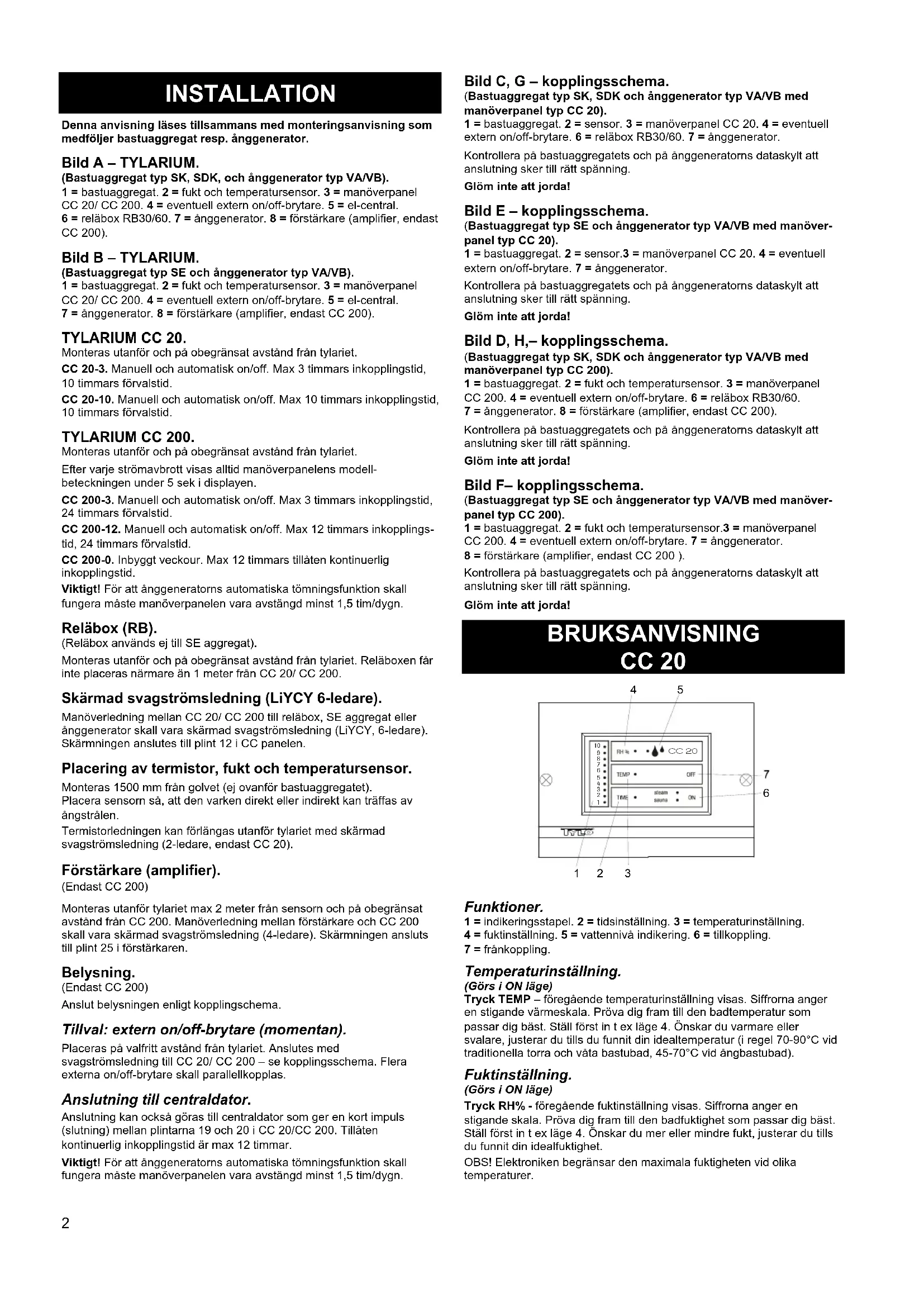 Ladda ner instruktionerna för din Termostat i PDF-format gratis! Hitta din manual CC200 - Tylö och ta tillbaka ditt elektroniska enhet i hand. På denna sida publiceras alla dokument som behövs för att använda din enhet. CC200 av märket Tylö.