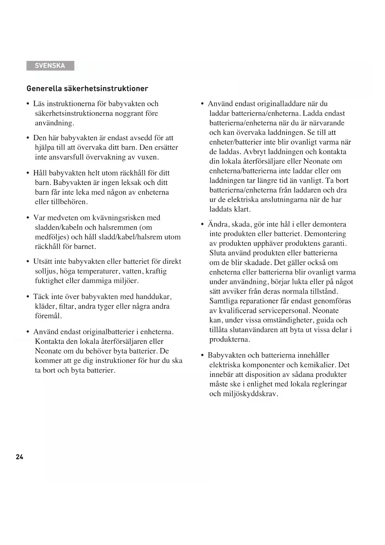 - Ändra, skada, gör inte hål i eller demontera inte produkten eller batteriet. Demontering av produkten upphäver produktens garanti. Sluta använd produkten eller batterierna om de blir skadade. Det gäller också om enheterna eller batterierna blir ovanligt varma under användning, börjar lukta eller på något sätt avviker från deras normala tillstånd. Samtliga reparationer får endast genomföras av kvalicerad servicepersonal. Neonate kan, under vissa omständigheter, guida och tillåta slutanvändaren att byta ut vissa delar i produkterna.