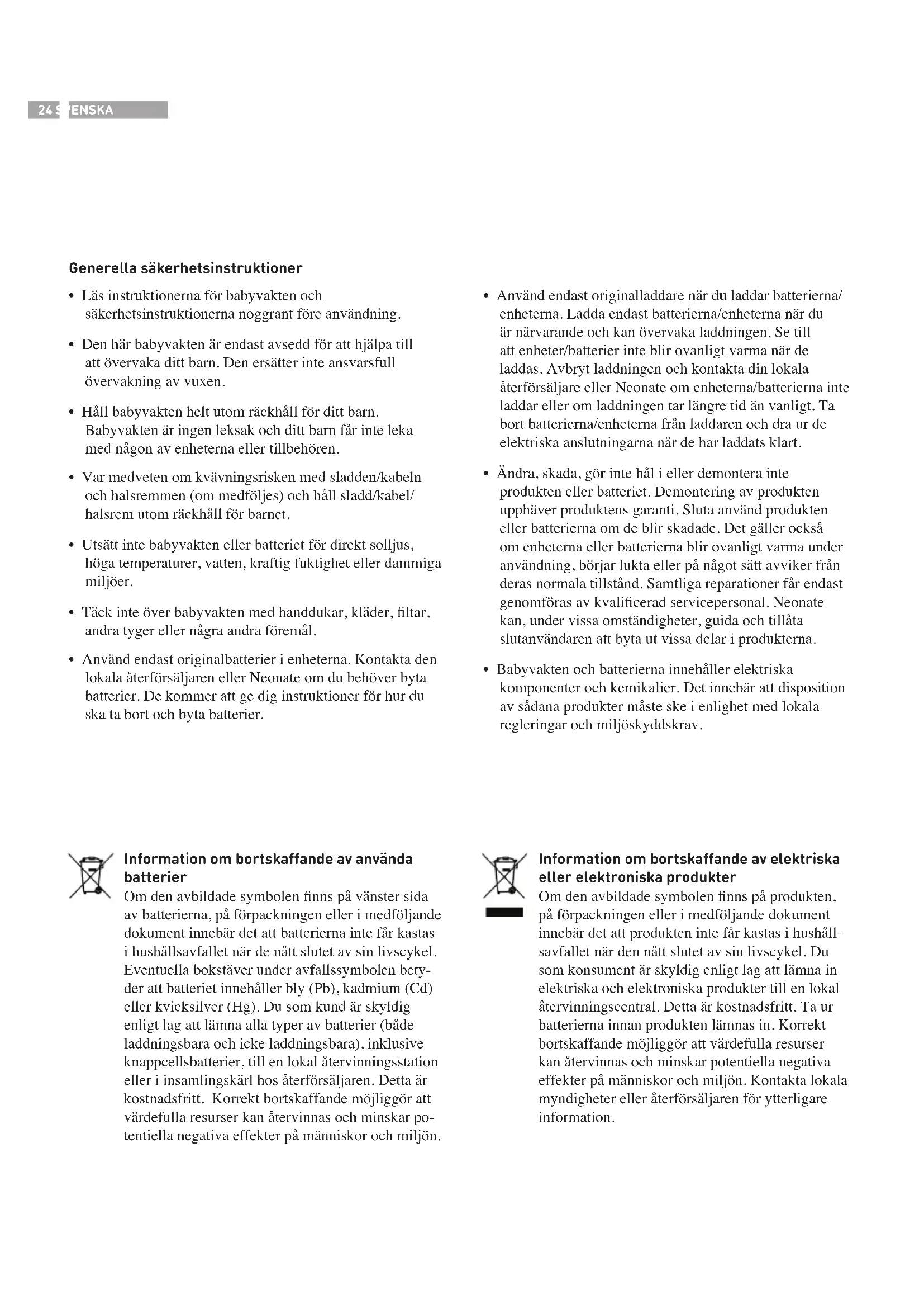 - Babyvakten och batterierna innehåller elektriska komponenter och kemikalier. Det innebär att disposition av sådana produkter måste ske i enlighet med lokala regleringar och miljöskyddskrav.25 Varning! Batterier kräver hänsyn. När du laddar ett batteri nns det alltid en risk för att en ko- rtslutning eller ett fabriksfel får batteriet att överhettas eller börja brinna. Vi rekommenderar därför att du aldrig laddar ett batteri utan tillsyn. Varning!