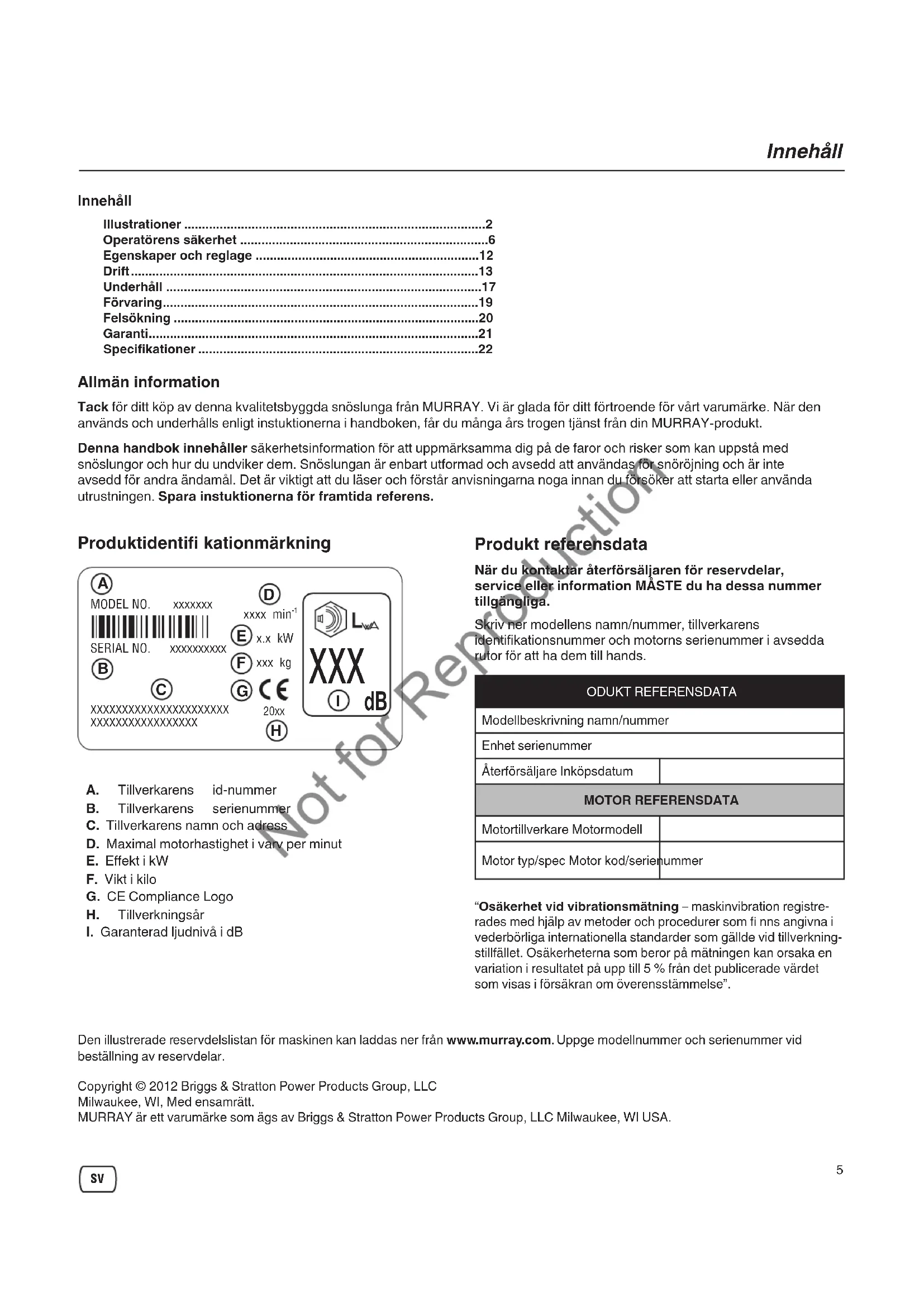 xxx kg XXXXXXXXXXXXXXXXXXXXXXXXXXXXXXXXXXXXXXX Den illustrerade reservdelslistan för maskinen kan laddas ner från www.murray.com. Uppge modellnummer och serienummer vid beställning av reservdelar.Copyright © 2012 Briggs & Stratton Power Products Group, LLCMilwaukee, WI, Med ensamrätt.MURRAY är ett varumärke som ägs av Briggs & Stratton Power Products Group, LLC Milwaukee, WI USA. Produktidentifi kationmärkning “Osäkerhet vid vibrationsmätning – maskinvibration registre-rades med hjälp av metoder och procedurer som fi nns angivna i vederbörliga internationella standarder som gällde vid tillverkning-stillfället. Osäkerheterna som beror på mätningen kan orsaka en variation i resultatet på upp till 5 % från det publicerade värdet som visas i försäkran om överensstämmelse”.A. Tillverkarens id-nummerB. Tillverkarens serienummerC. Tillverkarens namn och adressD. Maximal motorhastighet i varv per minutE. Effekt i kWF. Vikt i kiloG. CE Compliance LogoH. TillverkningsårI. Garanterad ljudnivå i dB Not for Reproduction6 Operatörens säkerhet På / Av nyckelbrytare. Vrid choke stängd för start. Vrid choke öppen för körning. Tryck primer 2 gånger. Uttag för förlängningssladd. Tryckknapp för start. Koppla in snöskruv. Rörvridning. Kall motor. Varm motor. Läs hanboken för användar- och säkerhetsinstruktioner. Stäng av motorn och ta bort nyckeln innan underhåll eller reparation utförs. Risk för utkastade föremål. Brandfara. Roterande snöskur / Amputeringsrisk. Risk för koldioxidförgiftning. Håll säkert avstånd. Elektriska stötar. Roterande impeller Amputeringsrisk. Håll barn på avstånd. Roterande impeller Amputeringsrisk. Amputeringsrisk - rör inte rörliga delar. Risk för heta ytor. Säkerhetssymboler och deras innebörd Reglagesymboler på utrustningen Not for Reproduction7