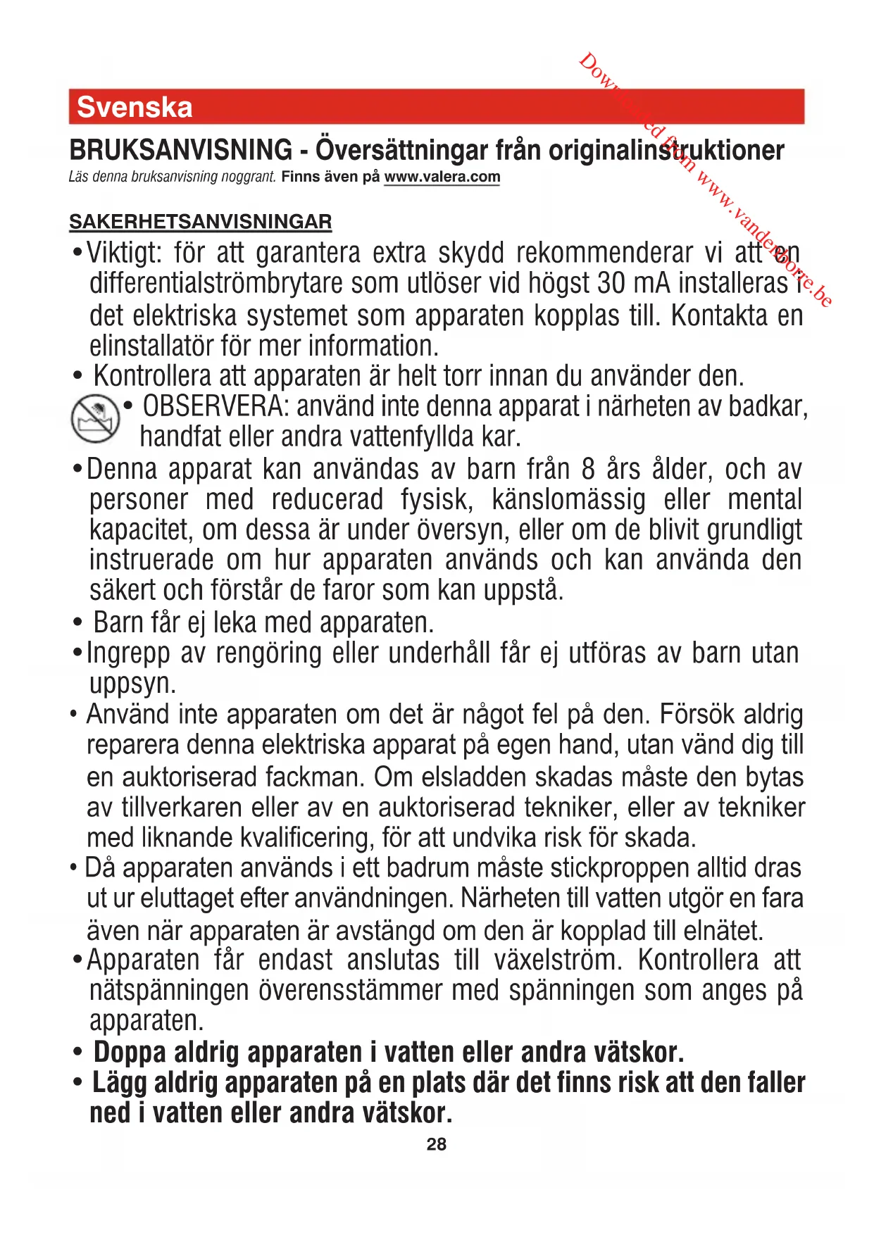 om reparationer görs av icke auktoriserade personer. Om fel uppstår ska apparaten återsändas väl emballerad tillsammans med ett daterat garantibevis som ska vara stämplat av återförsäljaren. Apparaten ska sändas till något av våra auktoriserade Servicecenter eller till återförsäljaren, som i sin tur sedan sörjer för att apparaten skickas vidare till den officiella importören för garantireparation. VIKTIGT INGEN av de hårtorkar som listas här är lämplig för installation och användning på allmän plats, gym, wellness/fitness-center, klubbar, spa, osv. med stor folkgenomströmning. Downloaded from www.vandenborre.be31 Suomi KAYTTOOHJEET - Alkuperäisen käyttöohjeen käännös Lue huolellisesti nämä käyttöohjeet. Saatavana myös osoitteesta www.valera.com TURVALLISUUSOHJEET