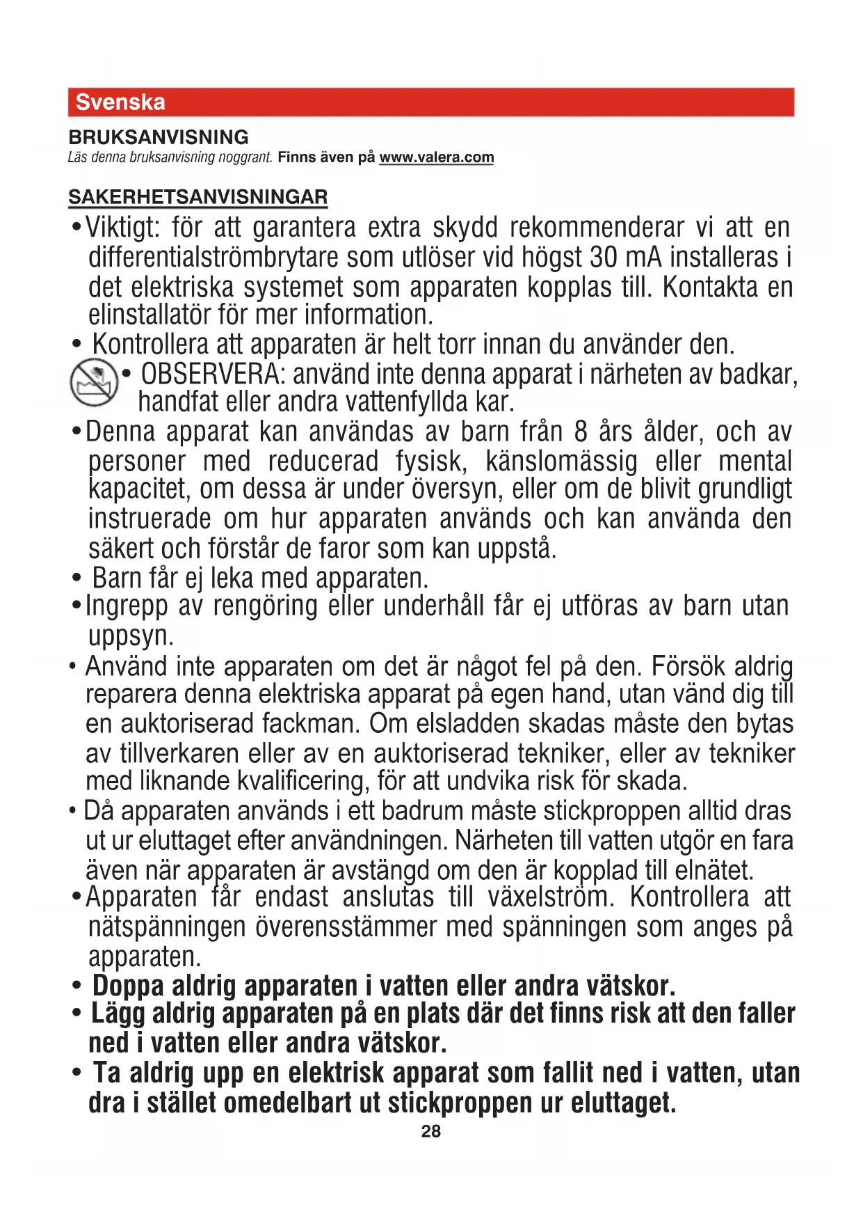 om reparationer görs av icke auktoriserade personer. Om fel uppstår ska apparaten återsändas väl emballerad tillsammans med ett daterat garantibevis som ska vara stämplat av återförsäljaren. Apparaten ska sändas till något av våra auktoriserade Servicecenter eller till återförsäljaren, som i sin tur sedan sörjer för att apparaten skickas vidare till den officiella importören för garantireparation. VIKTIGT INGEN av de hårtorkar som listas här är lämplig för installation och användning på allmän plats, gym, wellness/fitness-center, klubbar, spa, osv. med stor folkgenomströmning. För installation och användning på allmän plats, gym, wellness/fitness-center, klubbar, spa, osv. med liten folkgenomströmning, rekommenderar Valera enbart följande modeller SN9000 P • 583.11/P • 584.02/IP. VALERA är ett registrerat Ligo Electric S.A. varumärke - Schweiz31 Suomi KAYTTOOHJEET Lue huolellisesti nämä käyttöohjeet. Saatavana myös osoitteesta www.valera.com TURVALLISUUSOHJEET