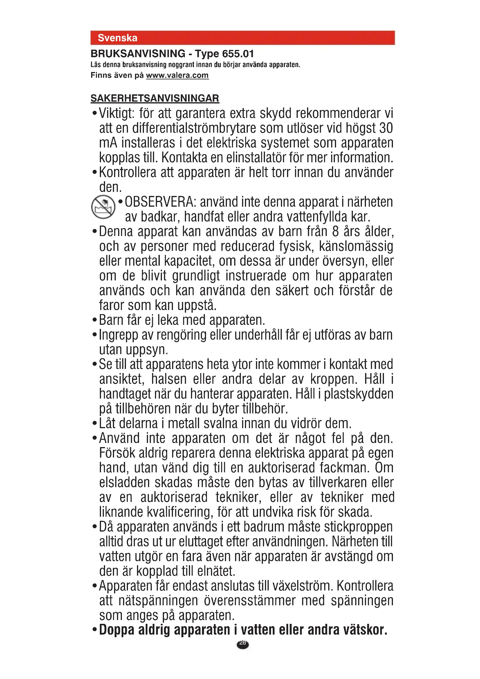 personer. Om fel uppstår ska apparaten återsändas väl emballerad tillsammans med ett daterat garantibevis som ska vara stämplat av återförsäljaren. Apparaten ska sändas till något av våra auktoriserade Servicecenter eller till återförsäljaren, som i sin tur sedan sörjer för att apparaten skickas vidare till den officiella importören för garantireparation. VALERA är ett registrerat Ligo Electric S.A. varumärke - Schweiz 00060587 int_ott2014 02/10/2014 8.29 Pagina 3031 Suomi KÄYTTÖOHJEET - Type 655.01 Lue nämä käyttöohjeet huolellisesti ennen käyttöä ja säilytä ne. Saatavana myös osoitteesta www.valera.com TURVALLISUUSOHJEET
