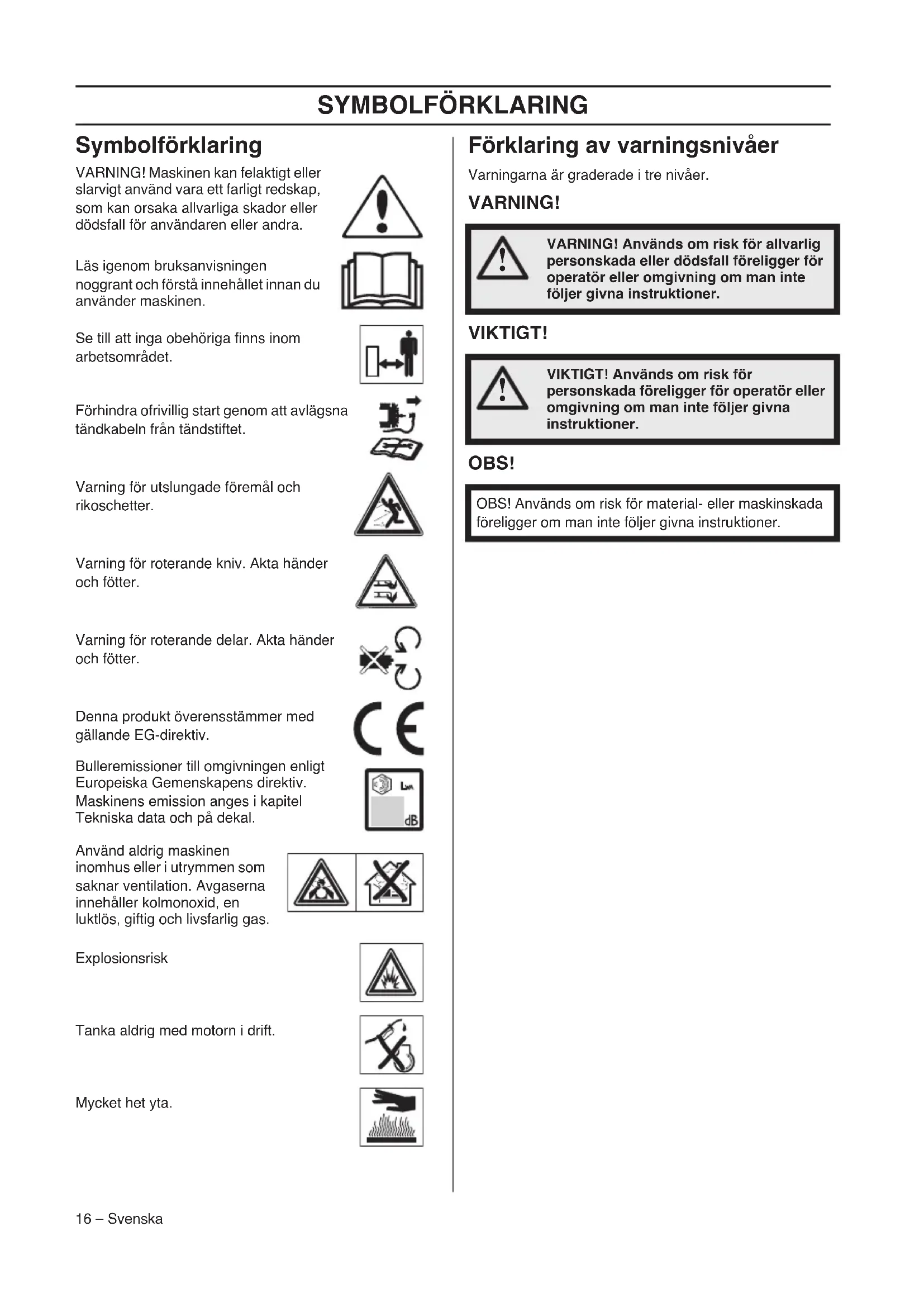 - of May 8, 2000 ”relating to the noise emissions in the environment” 2000/14/EC. For information relating to noise emissions, see the Technical data chapter. The following standards have been applied: EN 836, ISO 11094, EN 55012. Notified body: 0404, SMP Svensk Maskinprovning AB, Fyrisborgsgatan 3, SE-754 50 Uppsala, has issued reports regarding the assessment of conformity according to annex VI of the COUNCIL’S DIRECTIVE of May 8, 2000 ”relating to the noise emissions in the environment” 2000/14/EC. Huskvarna, 14 December 2012 Bengt Ahlund, Development manager (Authorized representative for Husqvarna AB and responsible for technical documentation.)SYMBOLFÖRKLARING 16 – Svenska Symbolförklaring VARNING! Maskinen kan felaktigt eller slarvigt använd vara ett farligt redskap, som kan orsaka allvarliga skador eller dödsfall för användaren eller andra. Läs igenom bruksanvisningen noggrant och förstå innehållet innan du använder maskinen. Se till att inga obehöriga finns inom arbetsområdet. Förhindra ofrivillig start genom att avlägsna tändkabeln från tändstiftet. Varning för utslungade föremål och rikoschetter. Varning för roterande kniv. Akta händer och fötter. Varning för roterande delar. Akta händer och fötter. Denna produkt överensstämmer med gällande EG-direktiv. Bulleremissioner till omgivningen enligt Europeiska Gemenskapens direktiv. Maskinens emission anges i kapitel Tekniska data och på dekal. Använd aldrig maskinen inomhus eller i utrymmen som saknar ventilation. Avgaserna innehåller kolmonoxid, en luktlös, giftig och livsfarlig gas. Explosionsrisk Tanka aldrig med motorn i drift. Mycket het yta. Förklaring av varningsnivåer Varningarna är graderade i tre nivåer. VARNING! VIKTIGT! OBS!