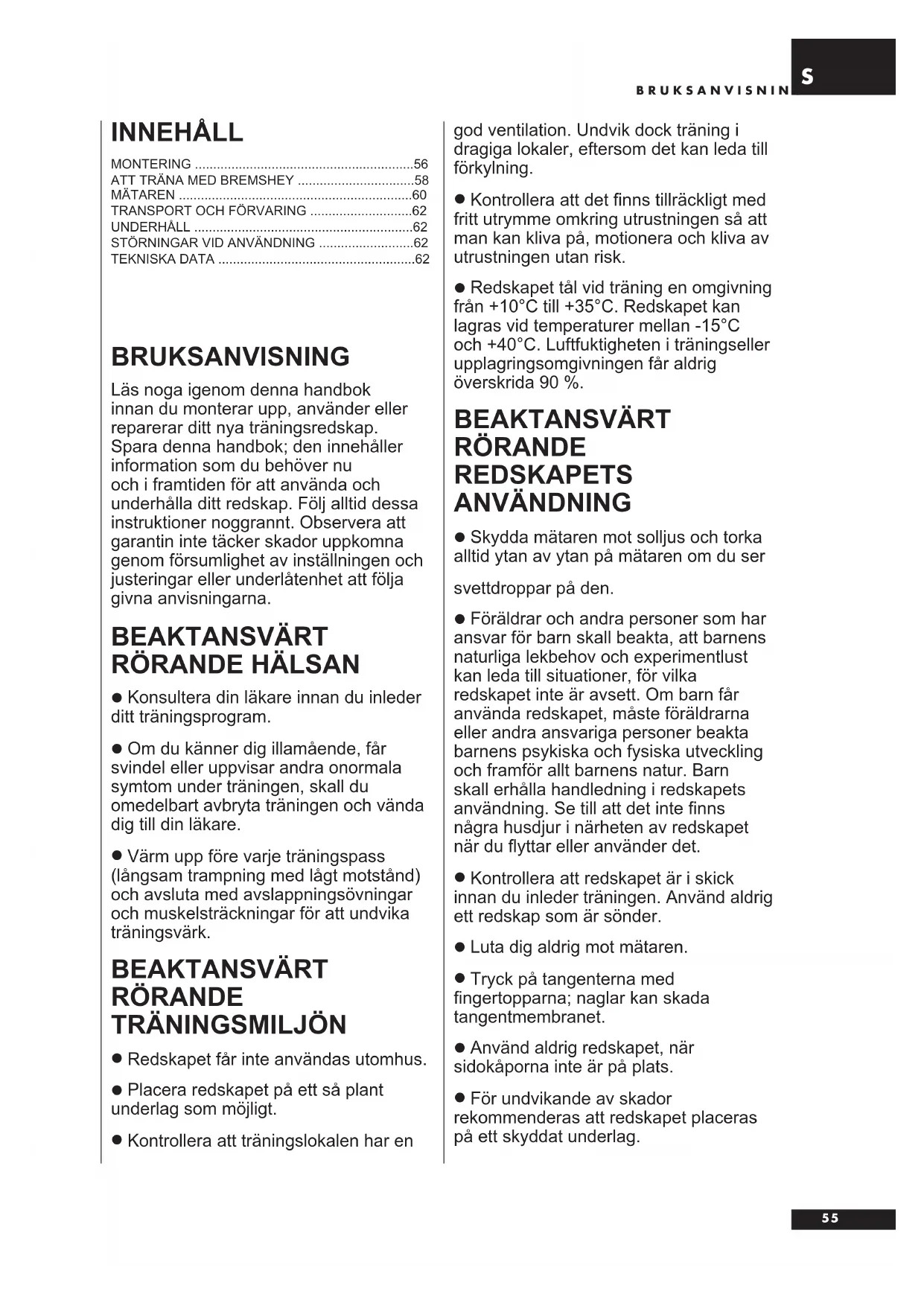 Läs noga igenomenna handbok innan du monterar upp, anvanderer reparerar dittnya träningsredskap. Sparaennahandbok;deninnerhaller information som du behover nu ochiframtidenforattanvandaoch underhalla ditt redskap.Folj alltid dessa instruktioner noggrannt.Observera att garantin inte tacker skador uppkomna genomforsumlighetavinstallningen och justeringarllerunderlatenhetattfolja givna anvisiningarna.