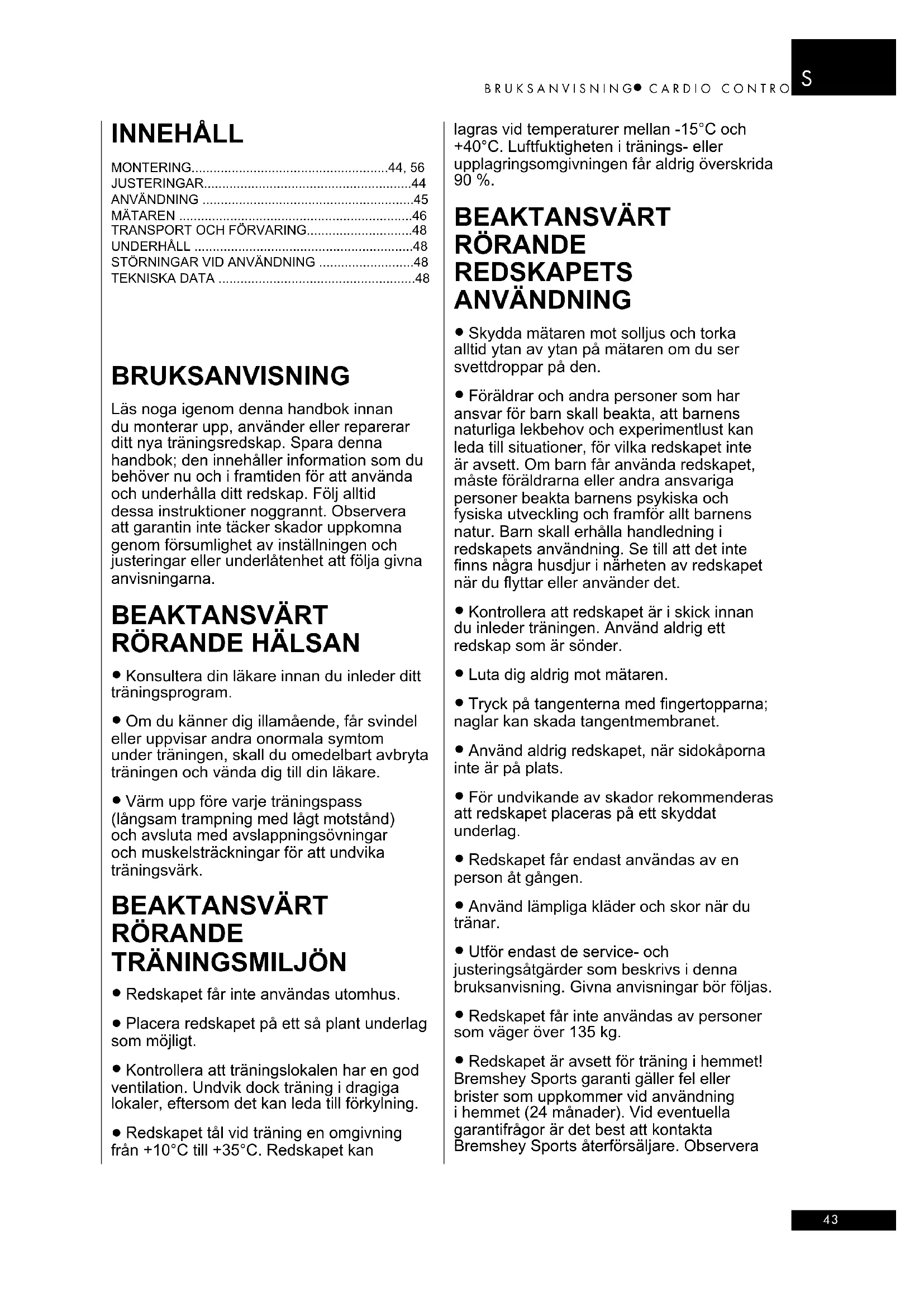 Läs noga igenom denna handbok innan du monterar upp, använder eller reparerar ditt nya träningsredskap. Spara denna handbok; den innehåller information som du behöver nu och i framtiden för att använda och underhålla ditt redskap. Följ alltid dessa instruktioner noggrannt. Observera att garantin inte täcker skador uppkomna genom försumlighet av inställningen och justeringar eller underlåtenhet att följa givna anvisningarna.