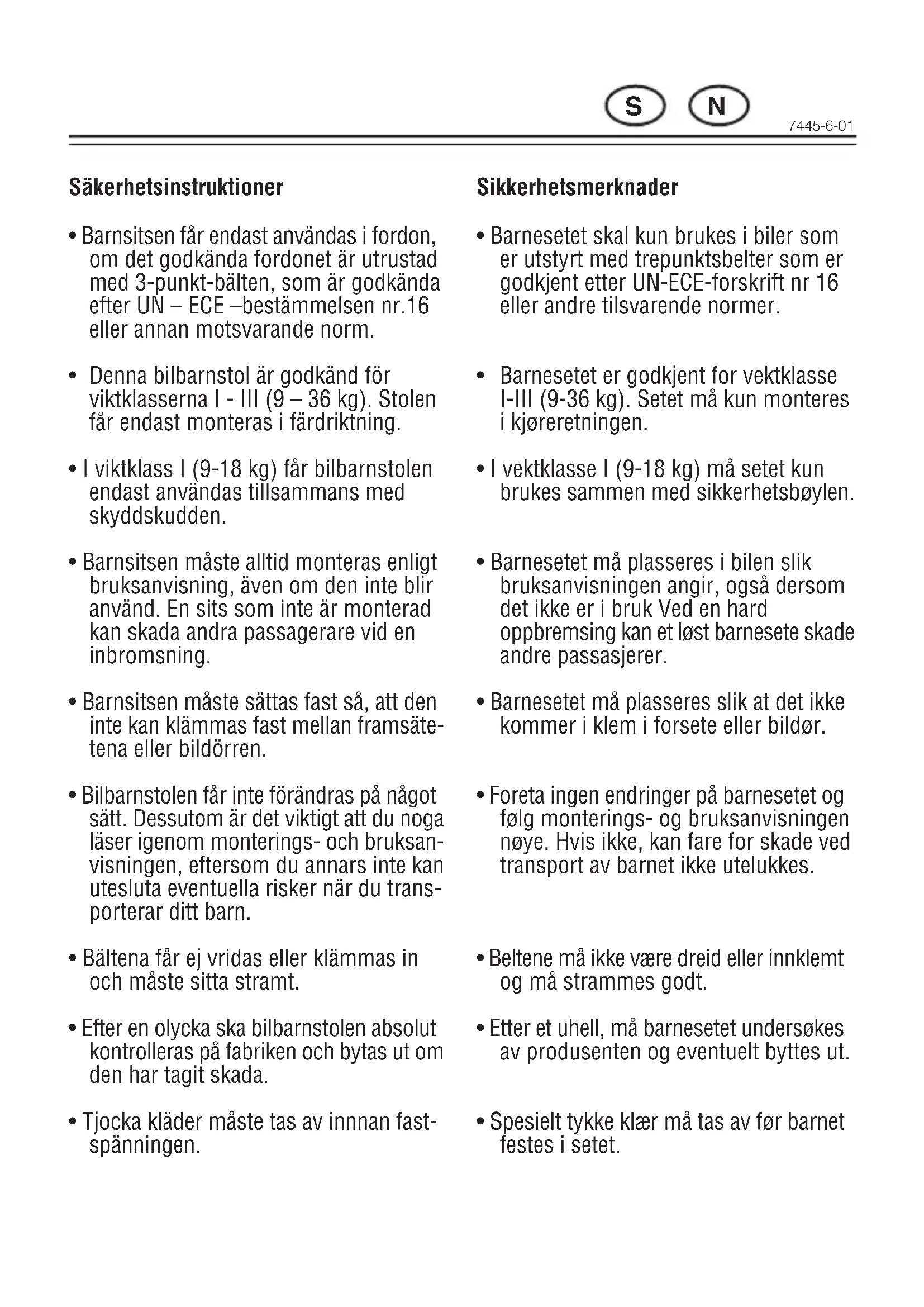 Endast lämplig att använda i bilar, som är utrustade med ECE-regel nr.16 godkändt 3-punkt säkerhetsbälte eller efter annan likartad standard. Detta är en sits viktklass I, II och III för barn med en kroppsvikt mellan 9 och 36 kg. Denna monterings-och bruksanvisning måste lämnas över till kunden. Tryckfel, misstag och tekniska ändringar förbehålls. OBS – Måste sparas för att kunna läsa igen senare.