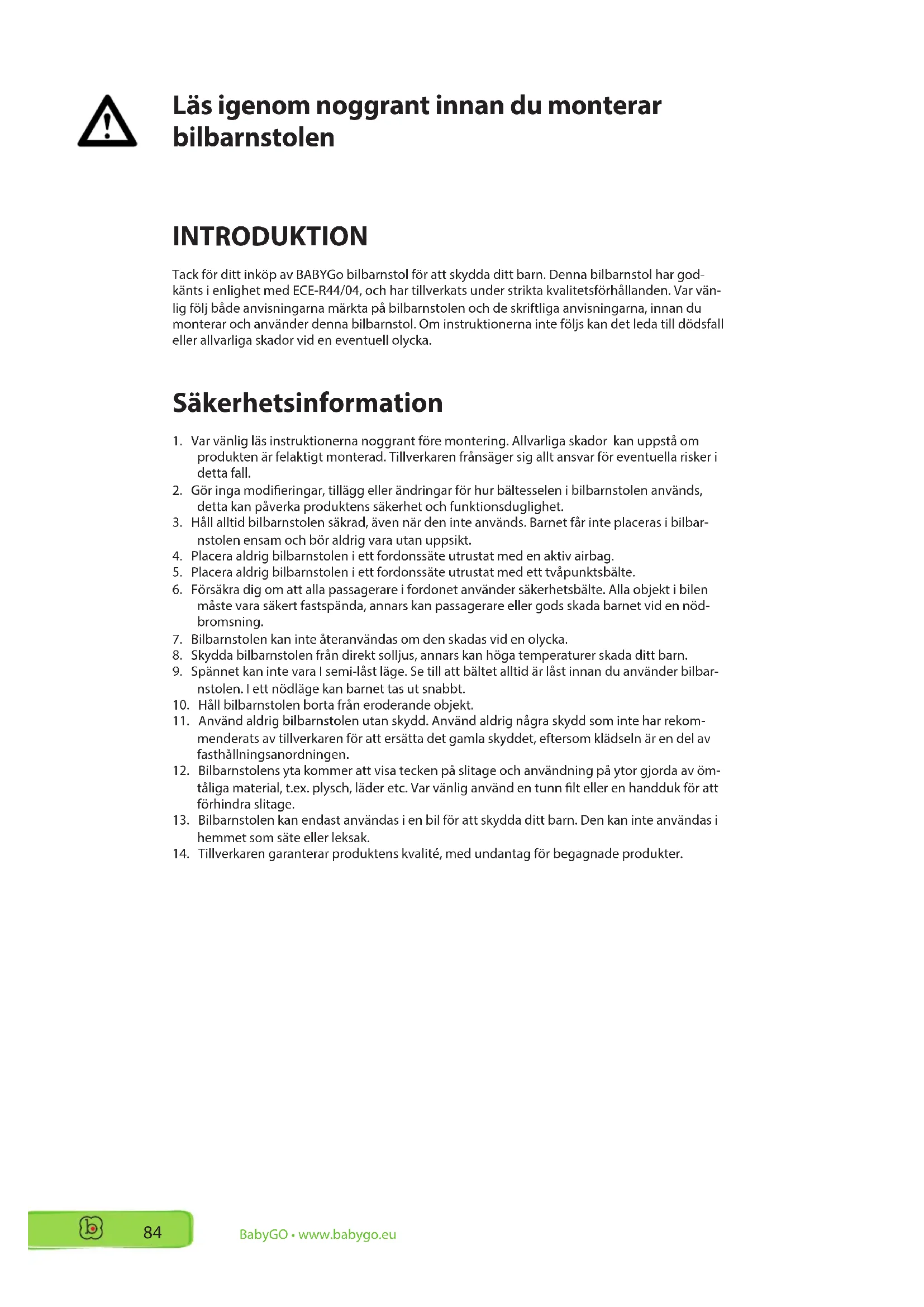BabyGO • www.babygo.eu INTRODUKTION Tack för ditt inköp av BABYGo bilbarnstol för att skydda ditt barn. Denna bilbarnstol har god- känts i enlighet med ECE-R44/04, och har tillverkats under strikta kvalitetsförhållanden. Var vän- lig följ både anvisningarna märkta på bilbarnstolen och de skriftliga anvisningarna, innan du monterar och använder denna bilbarnstol. Om instruktionerna inte följs kan det leda till dödsfall eller allvarliga skador vid en eventuell olycka. Säkerhetsinformation