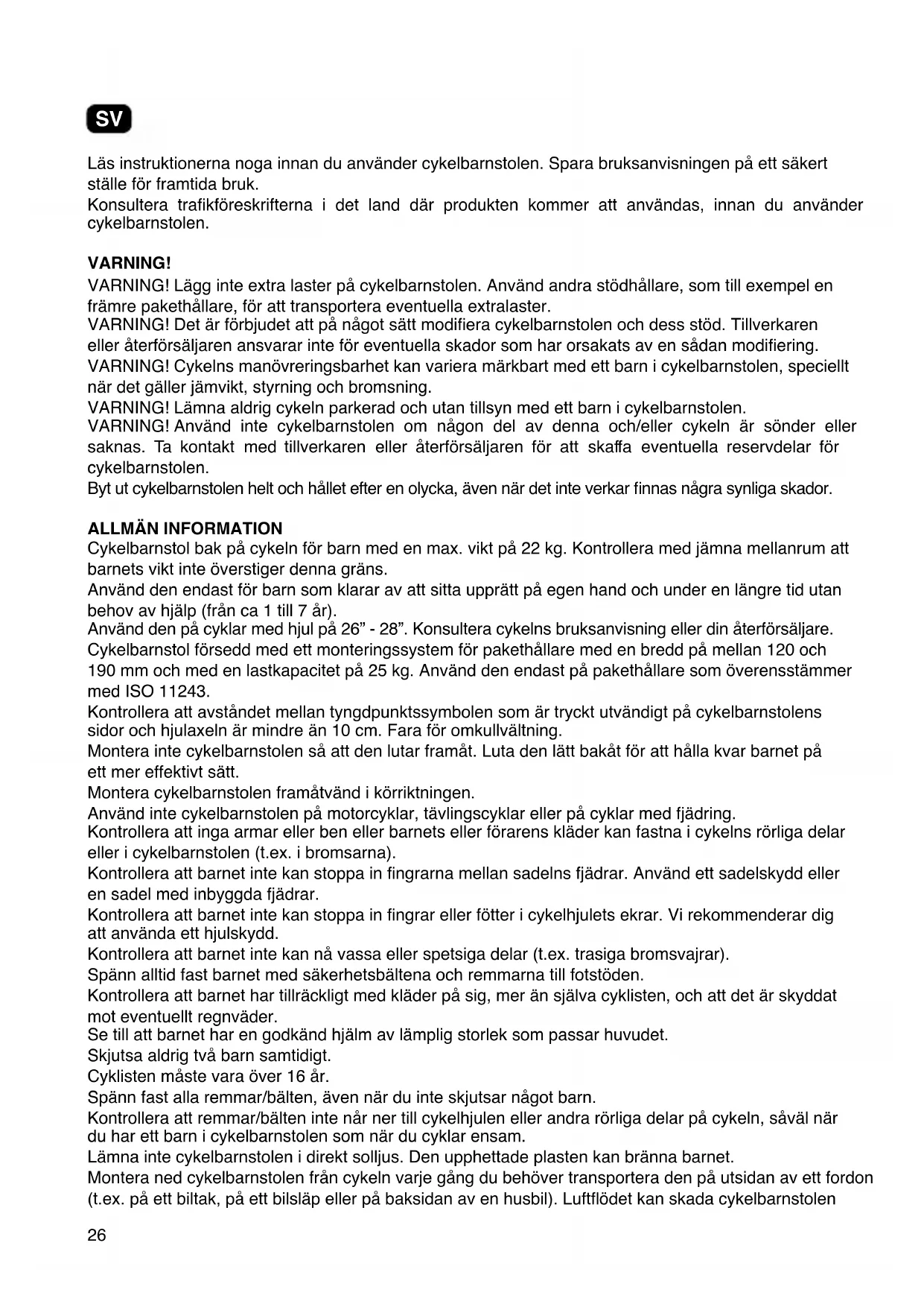 Cykelbarnstol bak på cykeln för barn med en max. vikt på 22 kg. Kontrollera med jämna mellanrum att barnets vikt inte överstiger denna gräns. Använd den endast för barn som klarar av att sitta upprätt på egen hand och under en längre tid utan behov av hjälp (från ca 1 till 7 år). Använd den på cyklar med hjul på 26” - 28”. Konsultera cykelns bruksanvisning eller din återförsäljare. Cykelbarnstol försedd med ett monteringssystem för pakethållare med en bredd på mellan 120 och 190 mm och med en lastkapacitet på 25 kg. Använd den endast på pakethållare som överensstämmer med ISO 11243. Kontrollera att avståndet mellan tyngdpunktssymbolen som är tryckt utvändigt på cykelbarnstolens sidor och hjulaxeln är mindre än 10 cm. Fara för omkullvältning. Montera inte cykelbarnstolen så att den lutar framåt. Luta den lätt bakåt för att hålla kvar barnet på ett mer effektivt sätt. Montera cykelbarnstolen framåtvänd i körriktningen. Använd inte cykelbarnstolen på motorcyklar, tävlingscyklar eller på cyklar med fjädring. Kontrollera att inga armar eller ben eller barnets eller förarens kläder kan fastna i cykelns rörliga delar eller i cykelbarnstolen (t.ex. i bromsarna). Kontrollera att barnet inte kan stoppa in ngrarna mellan sadelns fjädrar. Använd ett sadelskydd eller en sadel med inbyggda fjädrar. Kontrollera att barnet inte kan stoppa in ngrar eller fötter i cykelhjulets ekrar. Vi rekommenderar dig att använda ett hjulskydd. Kontrollera att barnet inte kan nå vassa eller spetsiga delar (t.ex. trasiga bromsvajrar). Spänn alltid fast barnet med säkerhetsbältena och remmarna till fotstöden. Kontrollera att barnet har tillräckligt med kläder på sig, mer än själva cyklisten, och att det är skyddat mot eventuellt regnväder. Se till att barnet har en godkänd hjälm av lämplig storlek som passar huvudet. Skjutsa aldrig två barn samtidigt. Cyklisten måste vara över 16 år. Spänn fast alla remmar/bälten, även när du inte skjutsar något barn. Kontrollera att remmar/bälten inte når ner till cykelhjulen eller andra rörliga delar på cykeln, såväl när du har ett barn i cykelbarnstolen som när du cyklar ensam. Lämna inte cykelbarnstolen i direkt solljus. Den upphettade plasten kan bränna barnet. Montera ned cykelbarnstolen från cykeln varje gång du behöver transportera den på utsidan av ett fordon (t.ex. på ett biltak, på ett bilsläp eller på baksidan av en husbil). Luftödet kan skada cykelbarnstolen SV27 eller bryta sönder fästena med vilka cykelbarnstolen är fäst på cykeln och förorsaka en olycka. Se över cykeln med jämna mellanrum: däck, bromsar, belysning o.s.v. Tvätta cykelbarnstolen med jämna mellanrum med tvål och vatten. Använd inte aggressiva lösningsmedel.