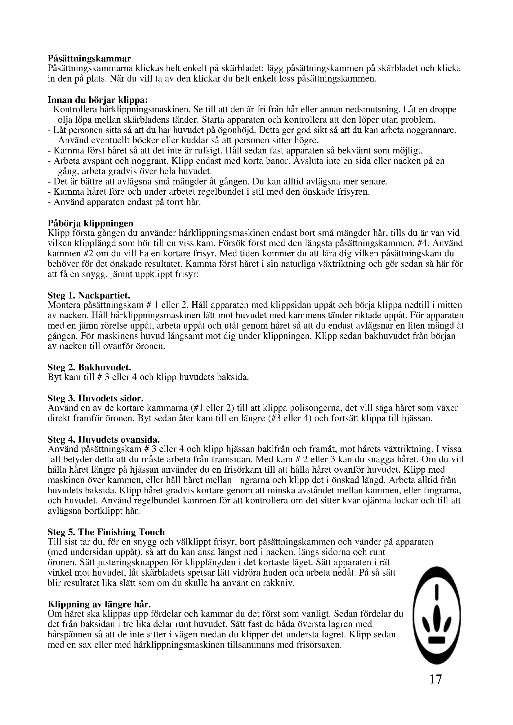 Klipp Första gangen du anvander harklippningsmaskinen endast bort små mangder hare, tills du ar van vid vilken klipplängd som hör till en viss kam. Försök Först med den langsta päsättningskammen, #4. Använd kammen #2 om du vill ha en kortare frisyr. Med tidenkommen du att lara dig vilken päsättningskam du behöver För det önskade resultatet. Kamma Först haret i sin naturliga växtriktning och gör sedan sa har För att fæ en snygg, jämnt uppklippt frisyr: