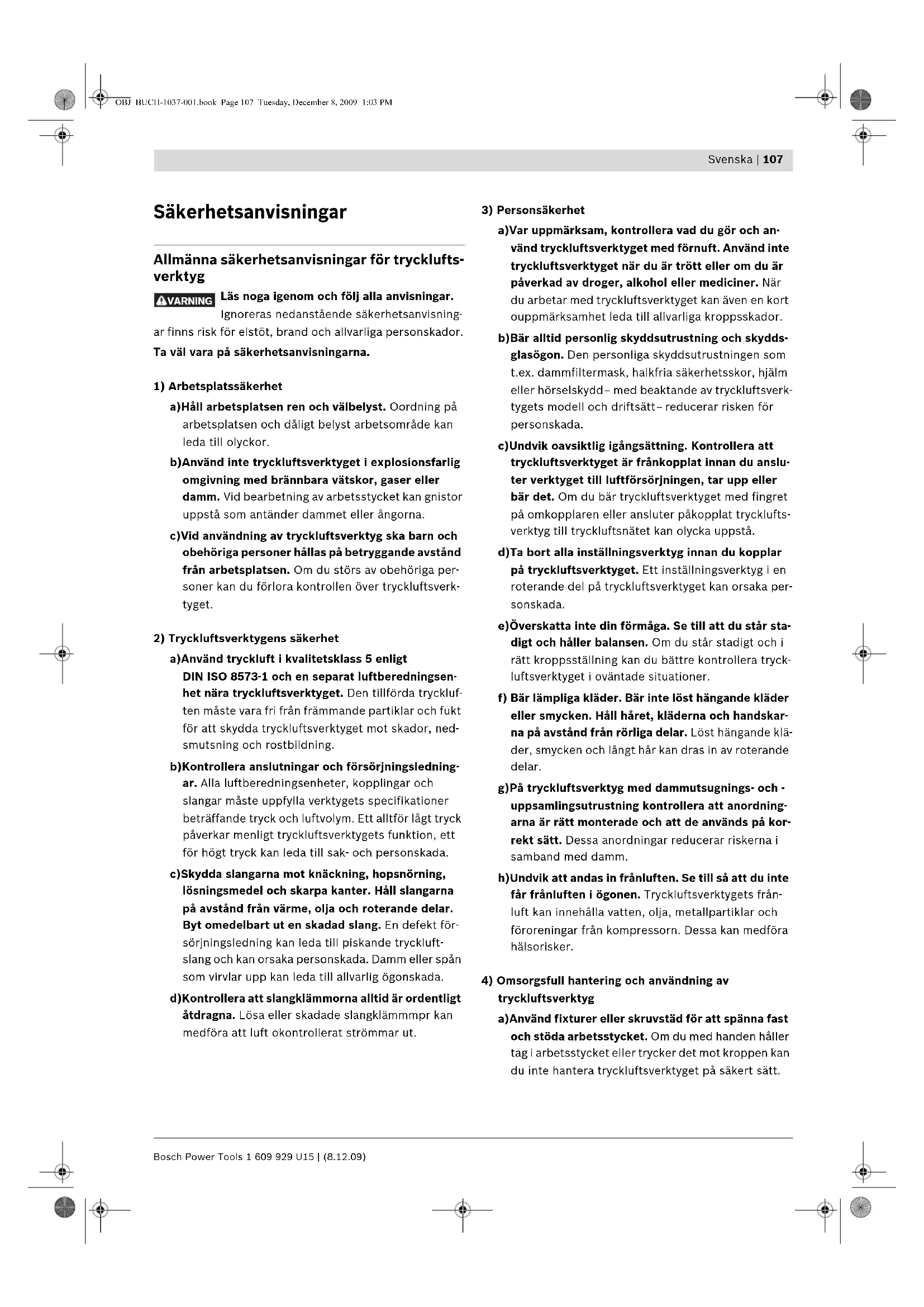 tryckluftsverktyg a)Använd fixturer eller skruvstäd för att spänna fast och stöda arbetsstycket. Om du med handen håller tag i arbetsstycket eller trycker det mot kroppen kan du inte hantera tryckluftsverktyget på säkert sätt. VARNING OBJ_BUCH-1037-001.book Page 107 Tuesday, December 8, 2009 1:03 PM1 609 929 U15 | (8.12.09) Bosch Power Tools 108 | Svenska b)Överbelasta inte tryckluftsverktyget. Använd för aktuellt arbete avsett tryckluftsverktyg. Med ett lämpligt tryckluftsverktyg kan du arbeta bättre och säkrare inom angivet effektområde. c)Ett tryckluftsverktyg med defekt omkopplare får inte längre användas. Ett tryckluftsverktyg som inte kan kopplas på eller från är farligt och måste repare- ras. d)Stäng av tryckluftstillförseln innan inställningar utförs på tryckluftsverktyget, tillbehörsdelar byts eller tryckluftsverktyget läggs bort. Denna säker- hetsåtgärd förhindrar oavsiktlig inkoppling av tryck- luftsverktyget. e)Förvara tryckluftsverktyget oåtkomliga för barn. Låt tryckluftsverktyget inte användas av personer som inte är förtrogna med dess användning eller inte läst denna anvisning. Tryckluftsverktygen är farliga om de användas av oerfarna personer. f) Sköt tryckluftsverktyget omsorgsfullt. Kontrollera att rörliga komponenter på tryckluftsverktyget fungerar felfritt och inte kärvar, att komponenter inte brustit eller skadats till den grad att tryck- luftsverktygets funktioner påverkas menligt. Låt skadade delar repareras innan tryckluftsverktyget åter tas i bruk. Många olyckor orsakas av dåligt skötta tryckluftsverktyg. g)Använd tryckluftsverktyg, tillbehör, insatsverktyg m.m. enligt dessa anvisningar. Ta hänsyn till ar- betsvillkoren och aktuellt arbetsmoment. Används tryckluftsverktyget på icke ändamålsenligt sätt kan farliga situationer uppstå.